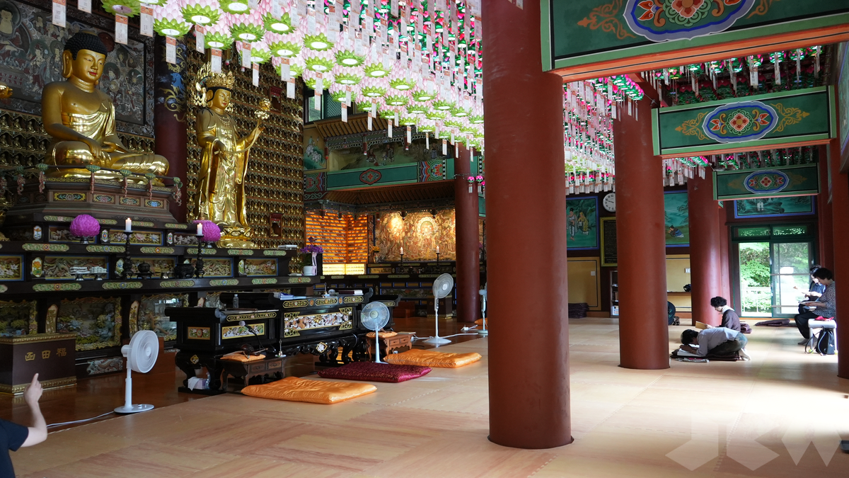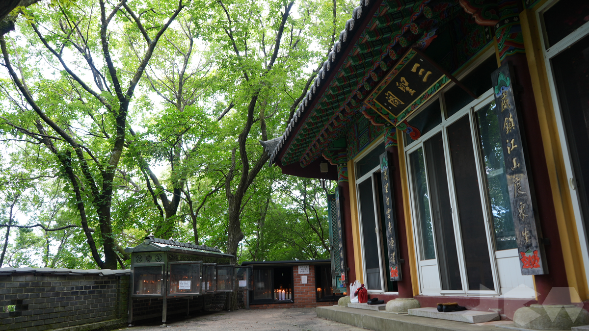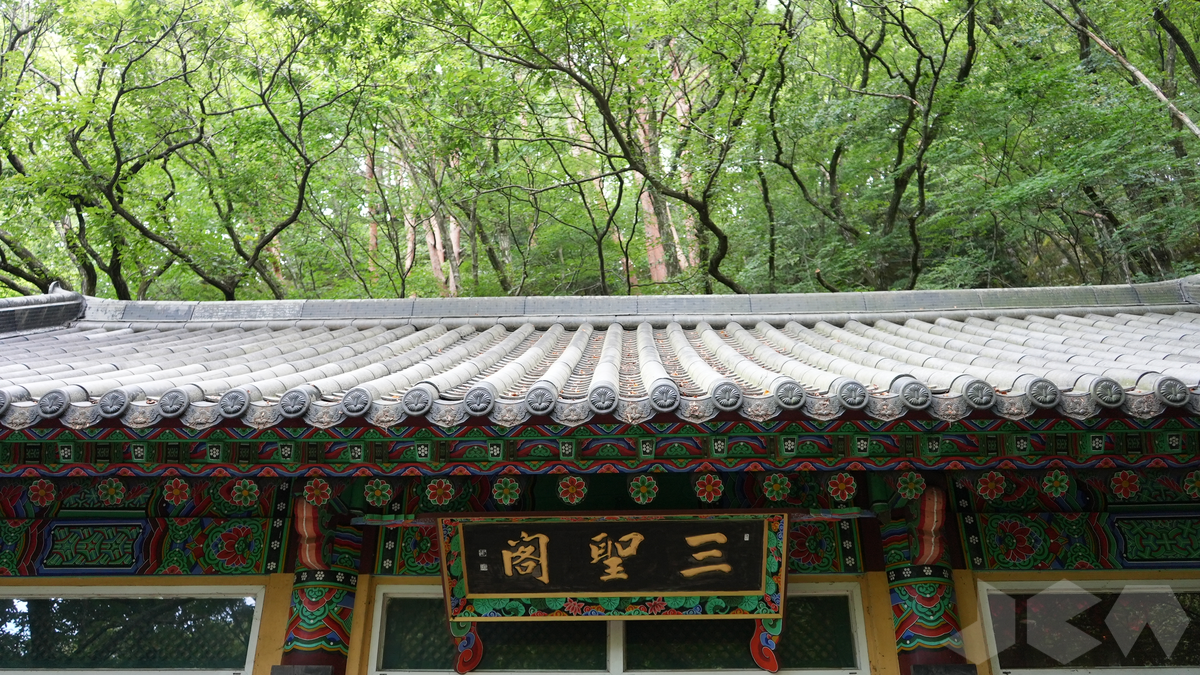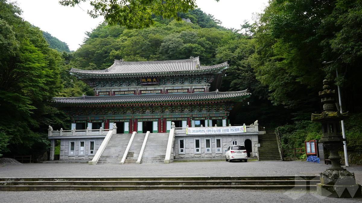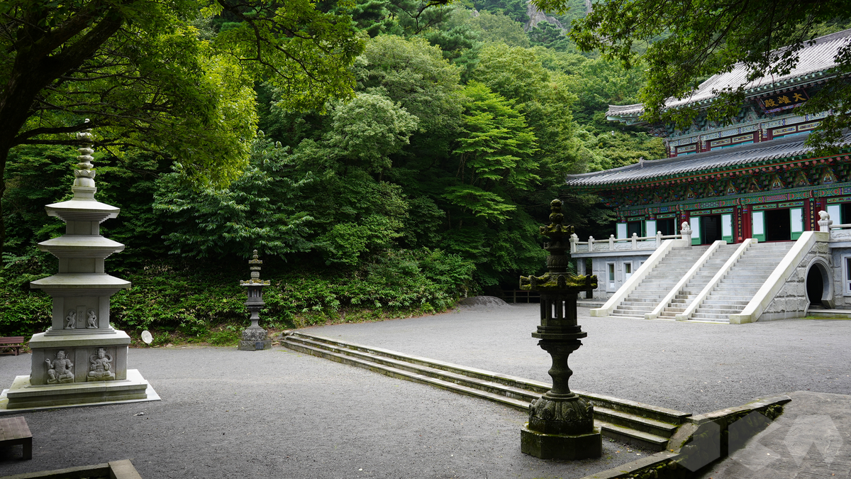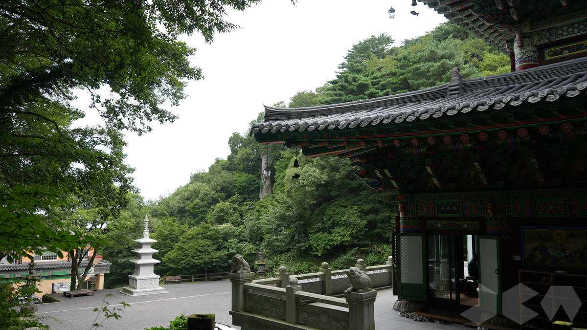 대웅전 바로 뒤로는 용바위라 불리는 커다란 바위가 있고, 마당 왼쪽 자락에 기세 좋게 곧게 뻗은 바위가 울창한 숲과 어우러져 절경을 이룬다.