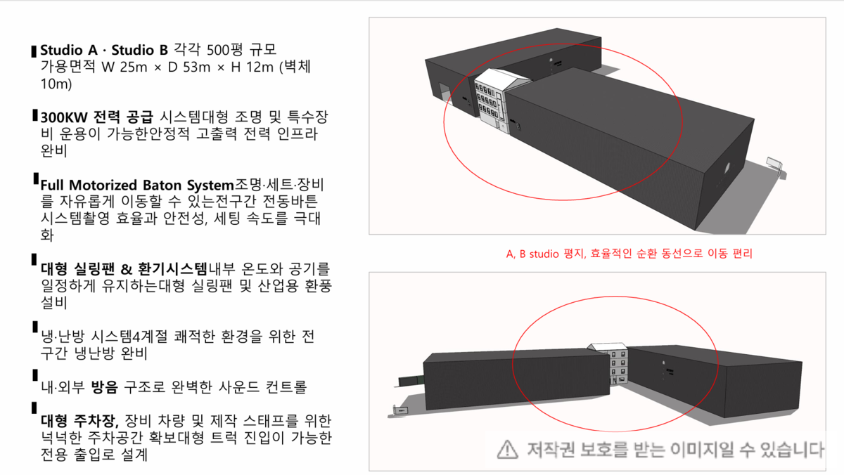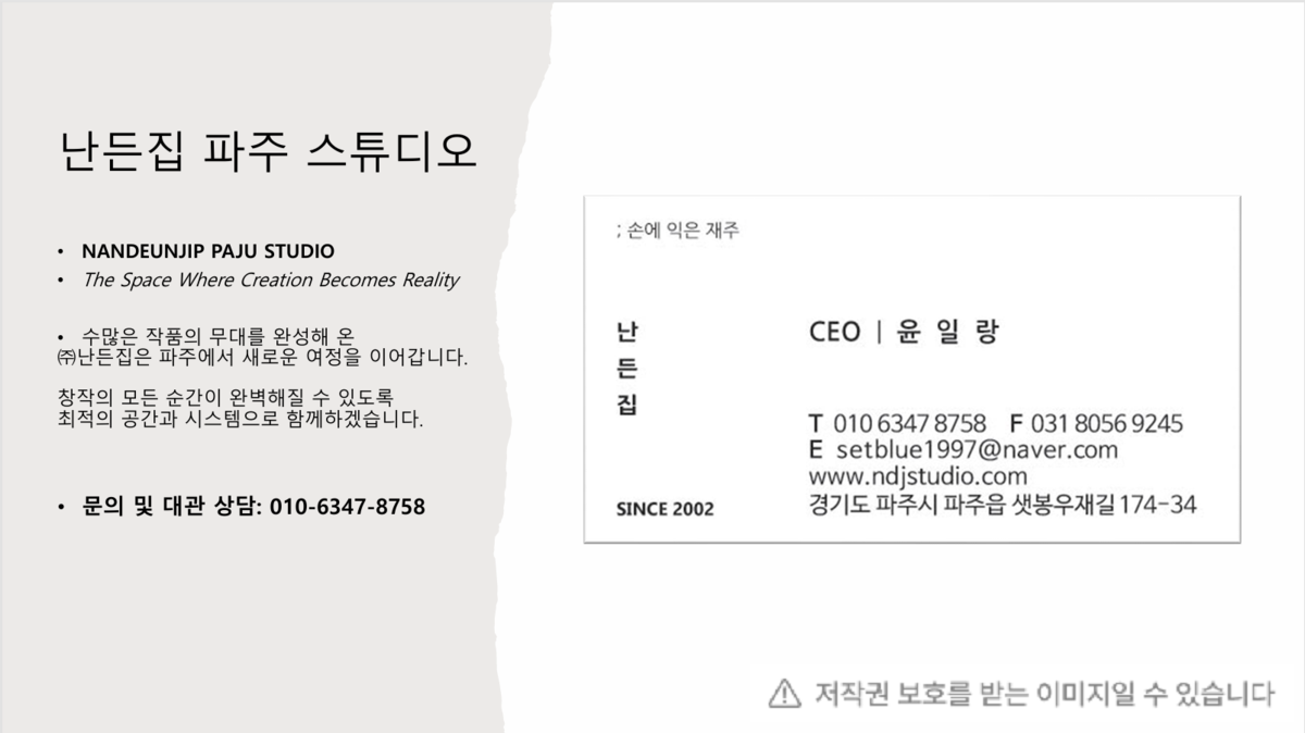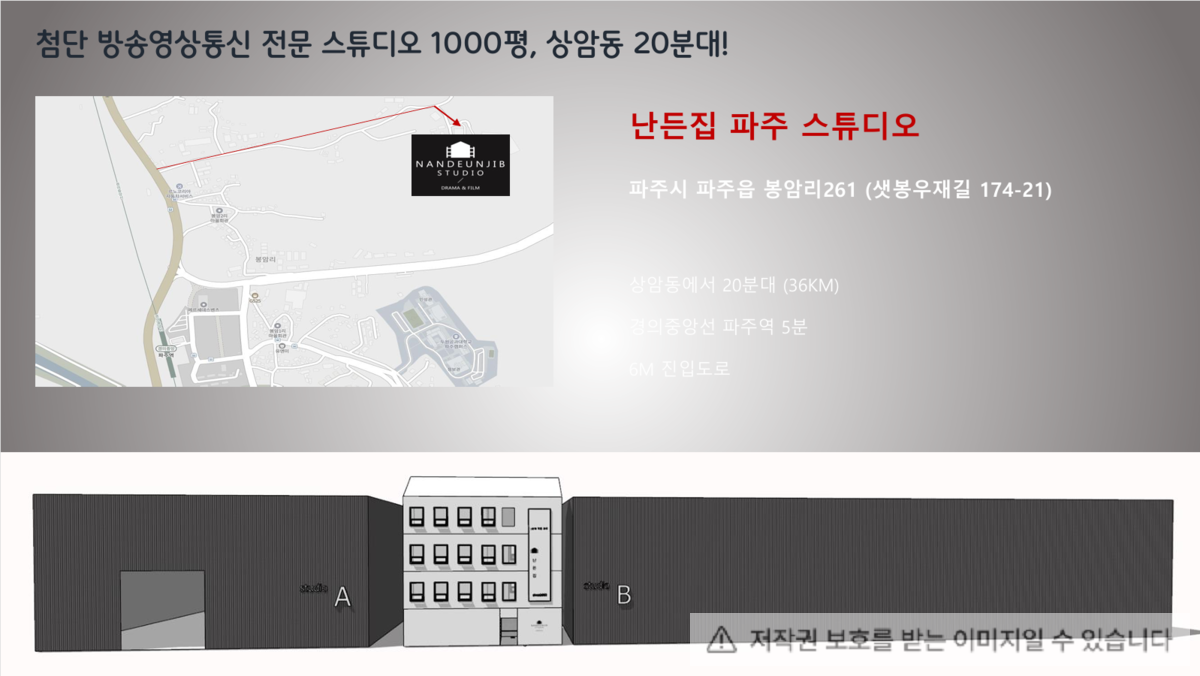 전동바튼과 내외부 방음, 대형 환기 및 냉난방 시스템을 갖춘 500평 규모의 스튜디오 2개 동은 대형 촬영부터 섬세한 세트 촬영까지 완벽히 대응합니다. 배우와 스태프를 위한 4층 편의동에는 엘리베이터와 함께 라운지, 남녀 화장실, VIP룸·의상실·분장실·샤워실·탕비실 등 촬영 현장의 편의와 휴식을 모두 고려한 시설이 완비되어 있습니다. 최상층에는 디렉터룸과 회의실, 프라이빗 라운지가 마련되어 현장의 효율과 품격을 동시에 담았습니다. 서울 상암 DMC에서 단 20분대, 도심과 자연의 경계에 자리한 난든집 파주 스튜디오는 기술과 예술, 효율과 감성이 공존하는 새로운 크리에이티브 베이스캠프입니다.