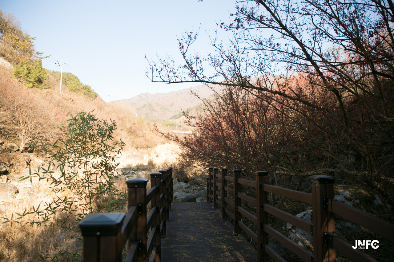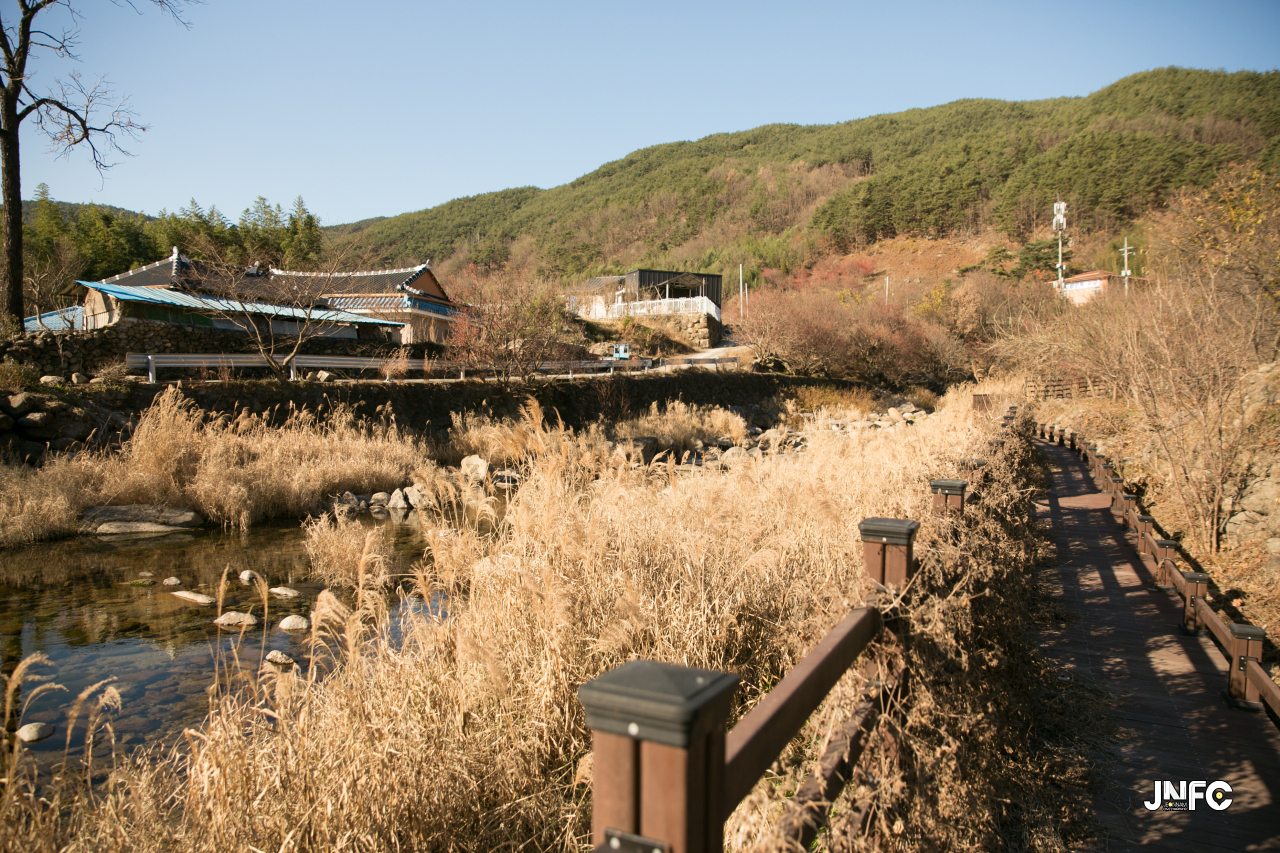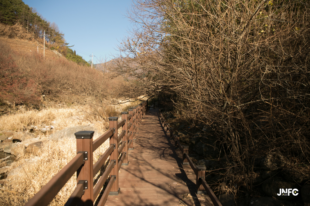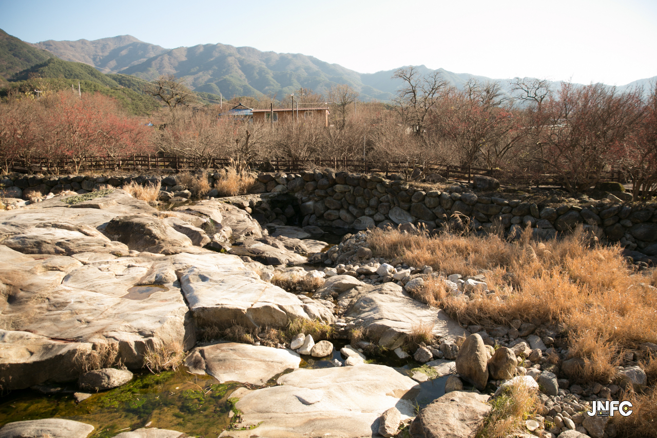 산수유 축제가 열리는 마을로 천변 옆을 따라 데크길이 놓여 있고, 바위사이로 흐르는 계곡물을 감상할 수 있다.