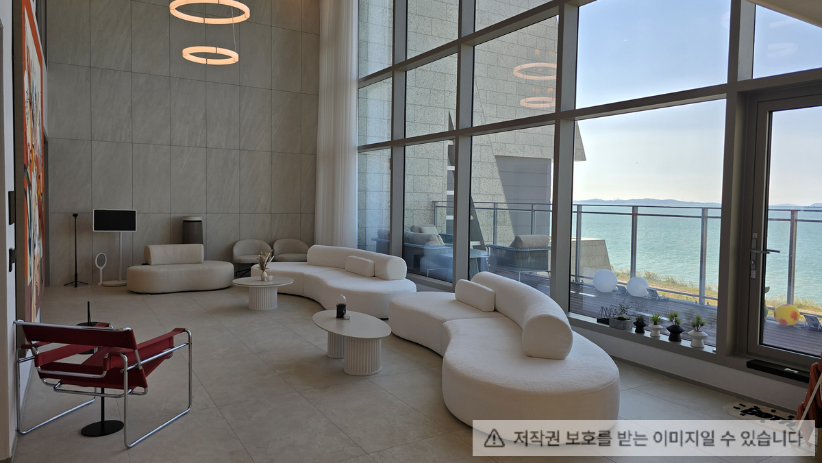 [압도적인 스케일과 최상의 조망권] 인천 송도의 랜드마크 아파트 최상층에 위치하며, 거실 전체를 덮는 통창을 통해 서해대교와 광활한 오션뷰를 파노라마로 담아냅니다. 2층 높이의 높은 층고와 개방감이 탁월한 공간 구성을 자랑합니다.