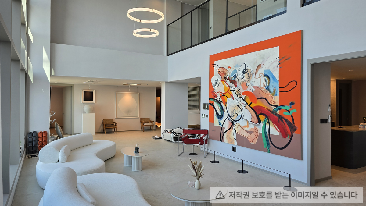[모던 & 갤러리 스타일 인테리어] 화이트 커브형 소파, 대형 아트월 페인팅, 미니멀한 가구 배치가 돋보이는 갤러리 콘셉트의 인테리어가 고급스럽고 세련된 분위기를 연출합니다.