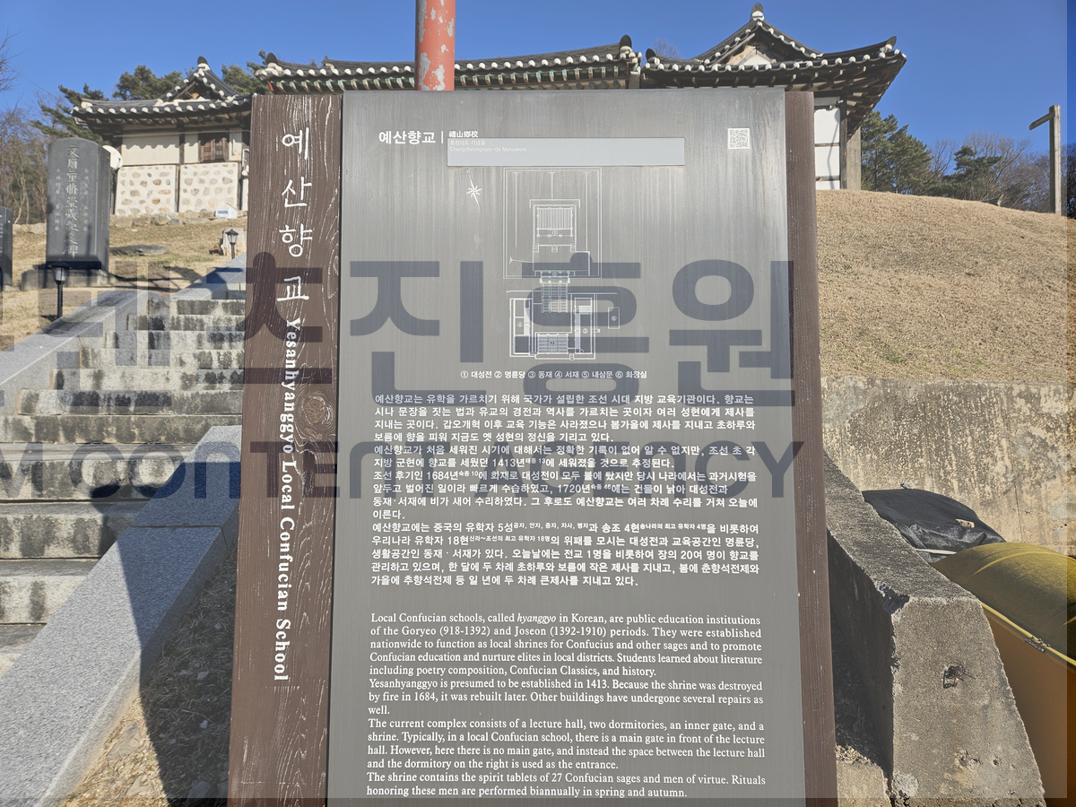 예산향교는 조선 태종 13년에 창건된 지방 국립 교육기관으로, 정갈한 기와지붕과 돌담길이 어우러져 사극이나 시대극의 서당 및 고택 장면을 담기에 최적화된 고즈넉한 분위기를 갖추고 있다. 경사진 지형에 건물이 배치된 '전학후묘' 구조 덕분에 계단 위아래를 활용한 입체적인 인물 구도 연출이 가능하며, 세월의 흔적이 묻어나는 건축물 자체가 훌륭한 미장센이 된다.