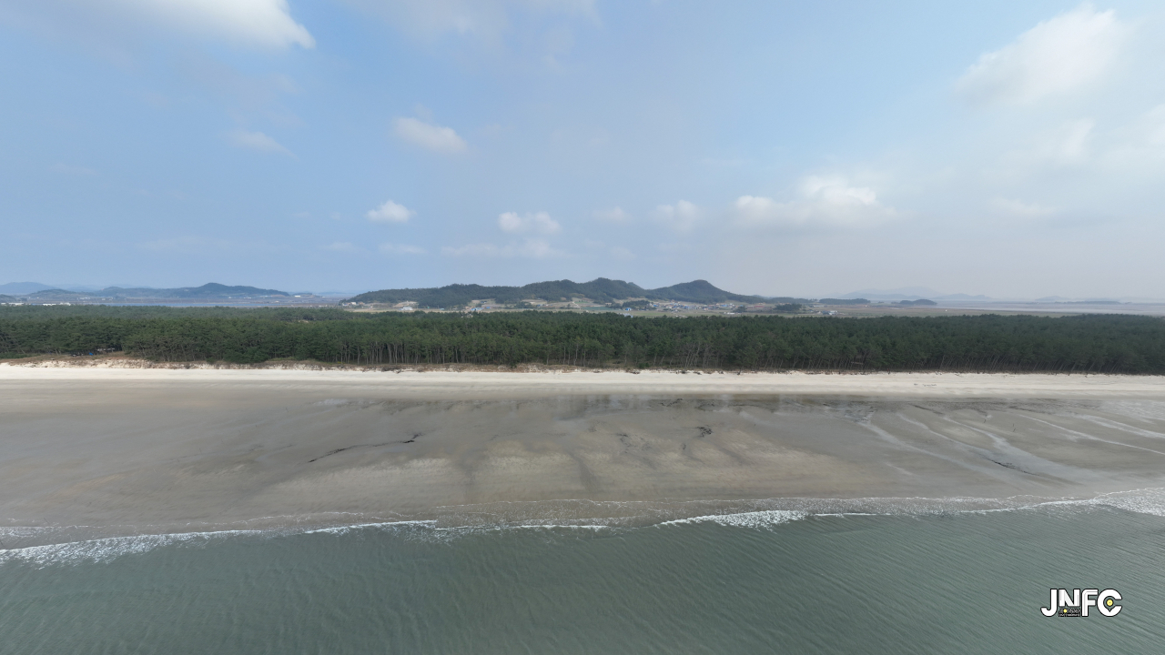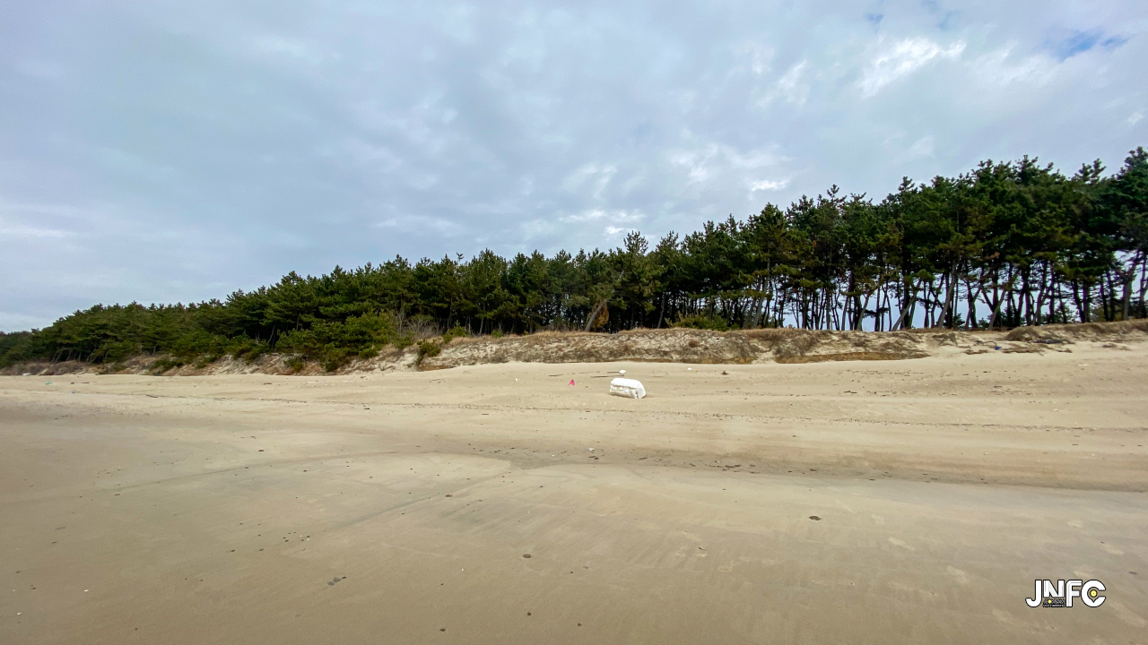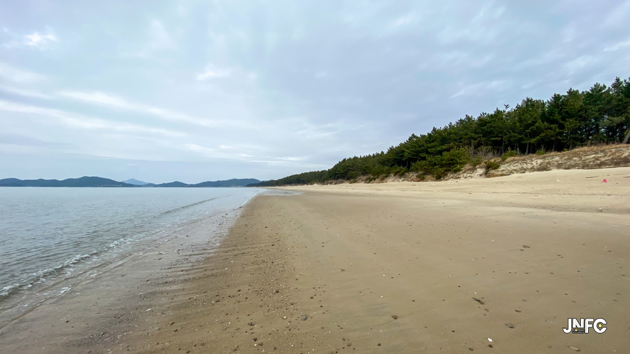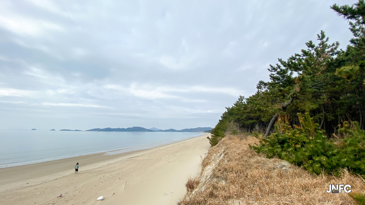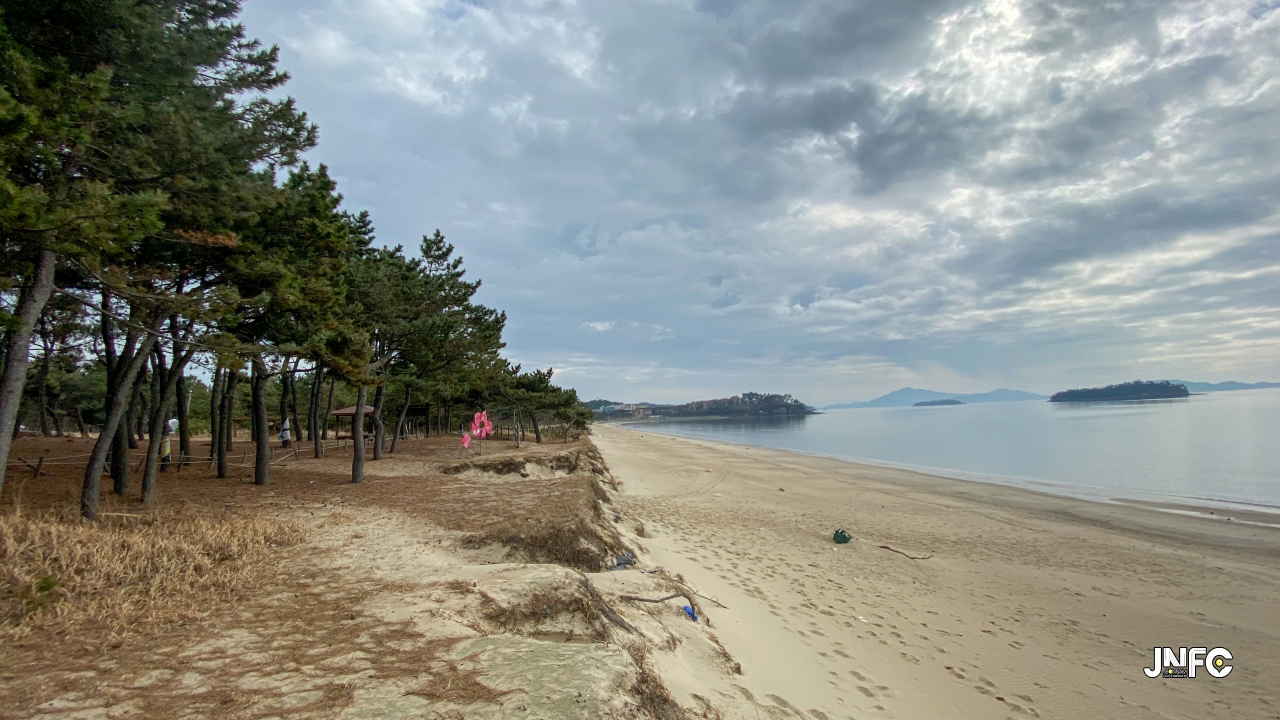 하얀 모래사장이 길게 늘어져 있고 뒷편으로는 소나무가 방풍림으로 조성이 되어 있다.