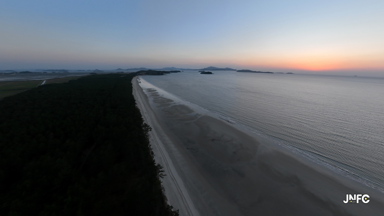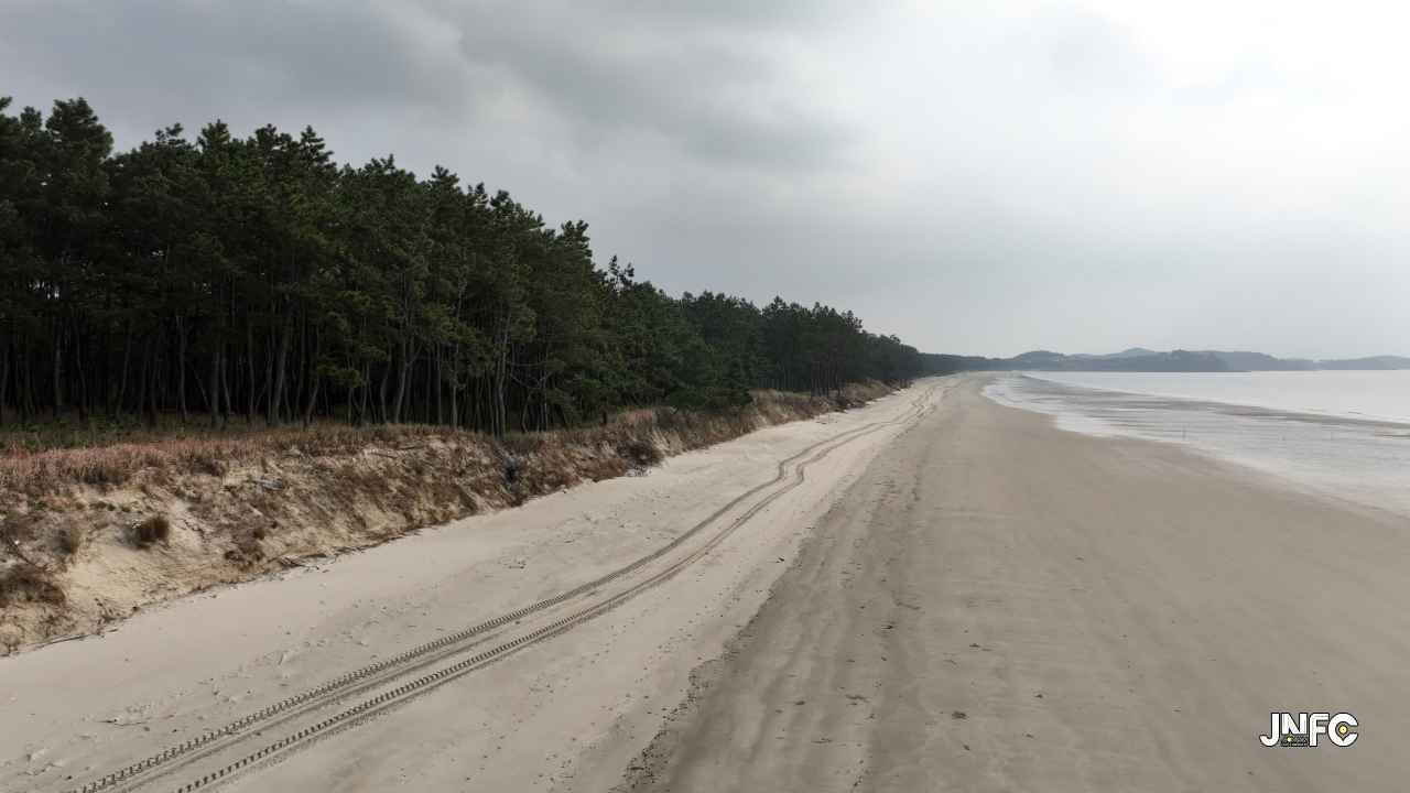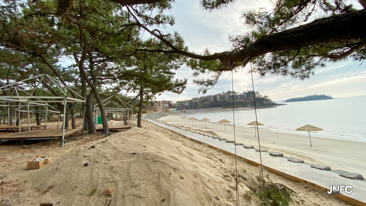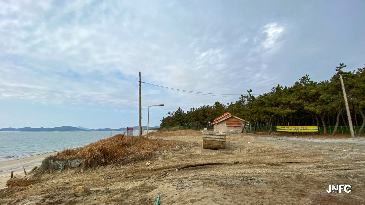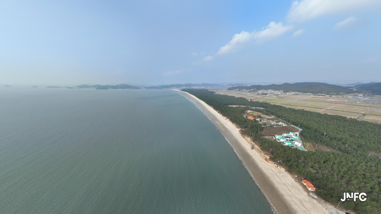 하얀 모래사장이 길게 늘어져 있고 뒷편으로는 소나무가 방풍림으로 조성이 되어 있다.