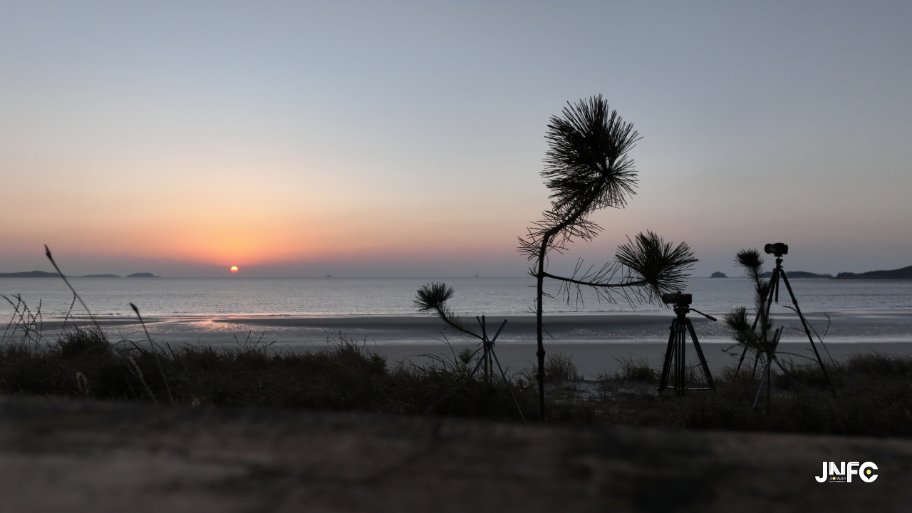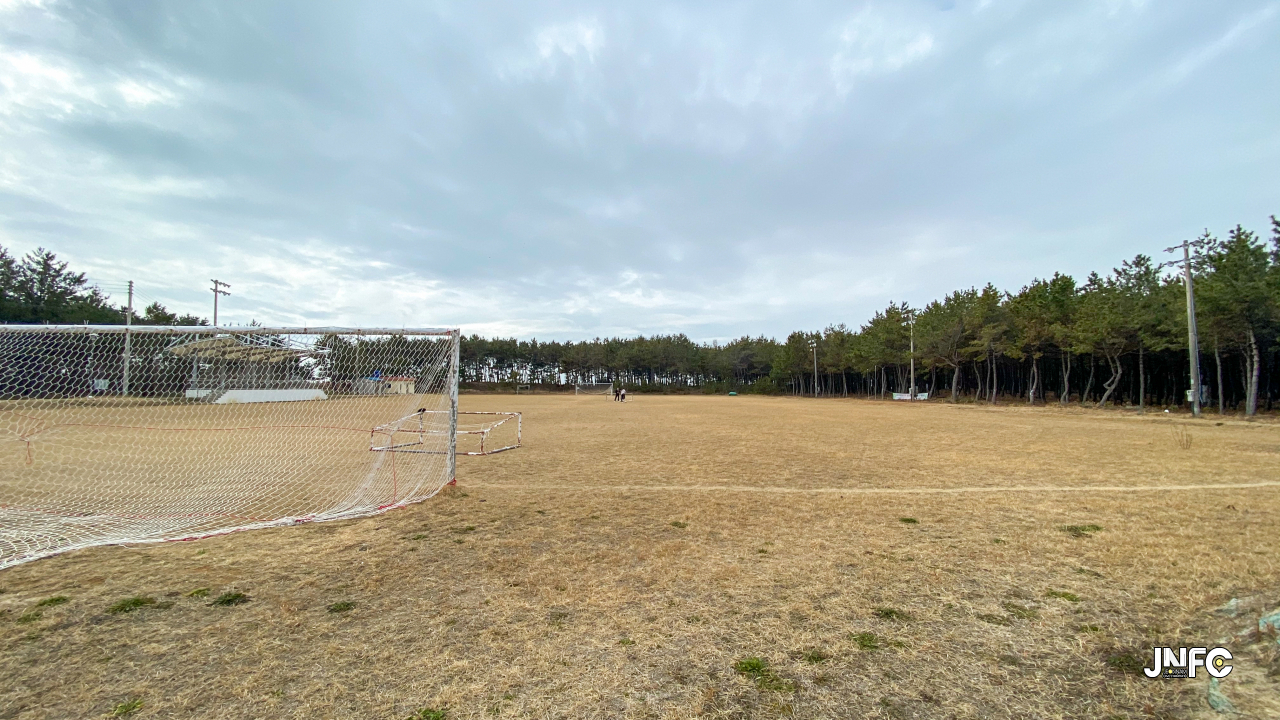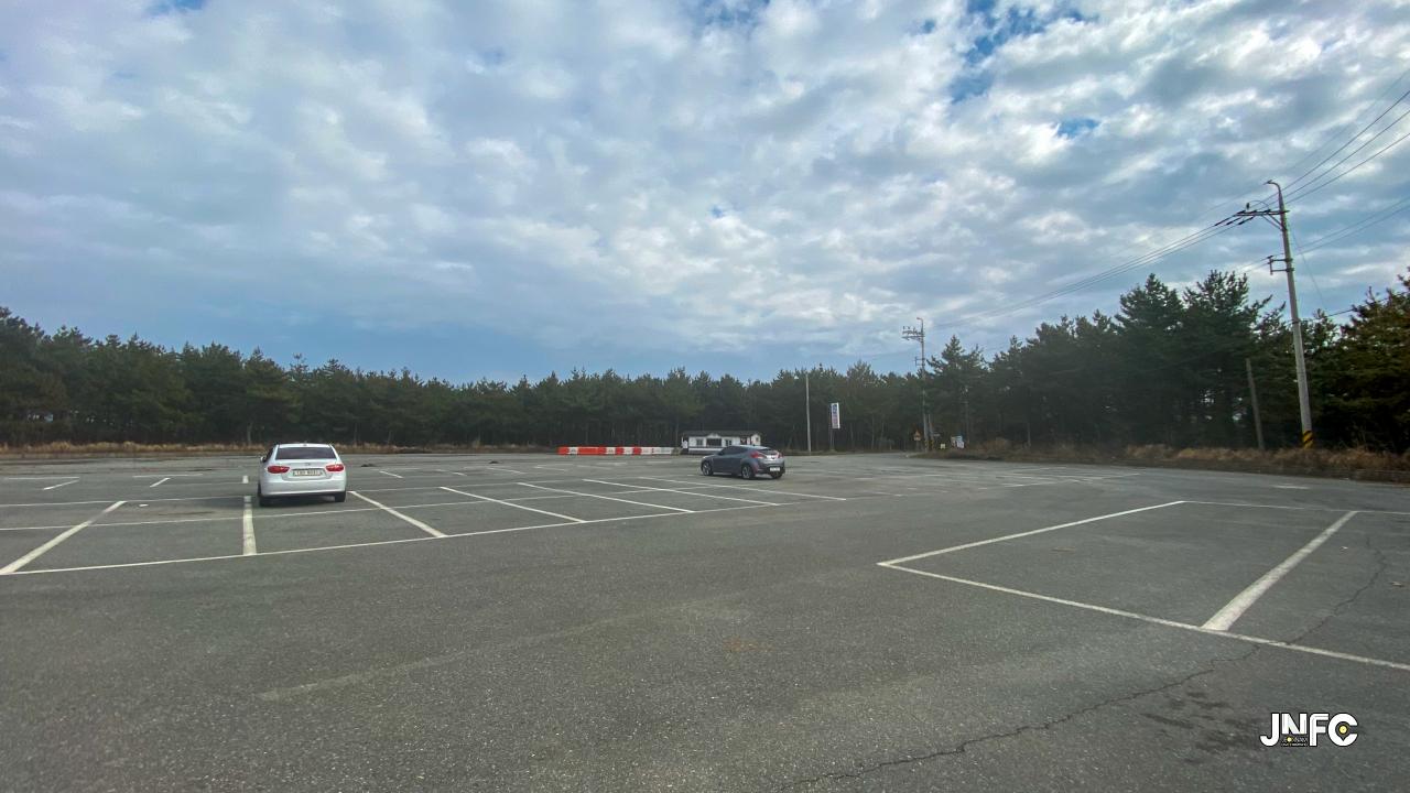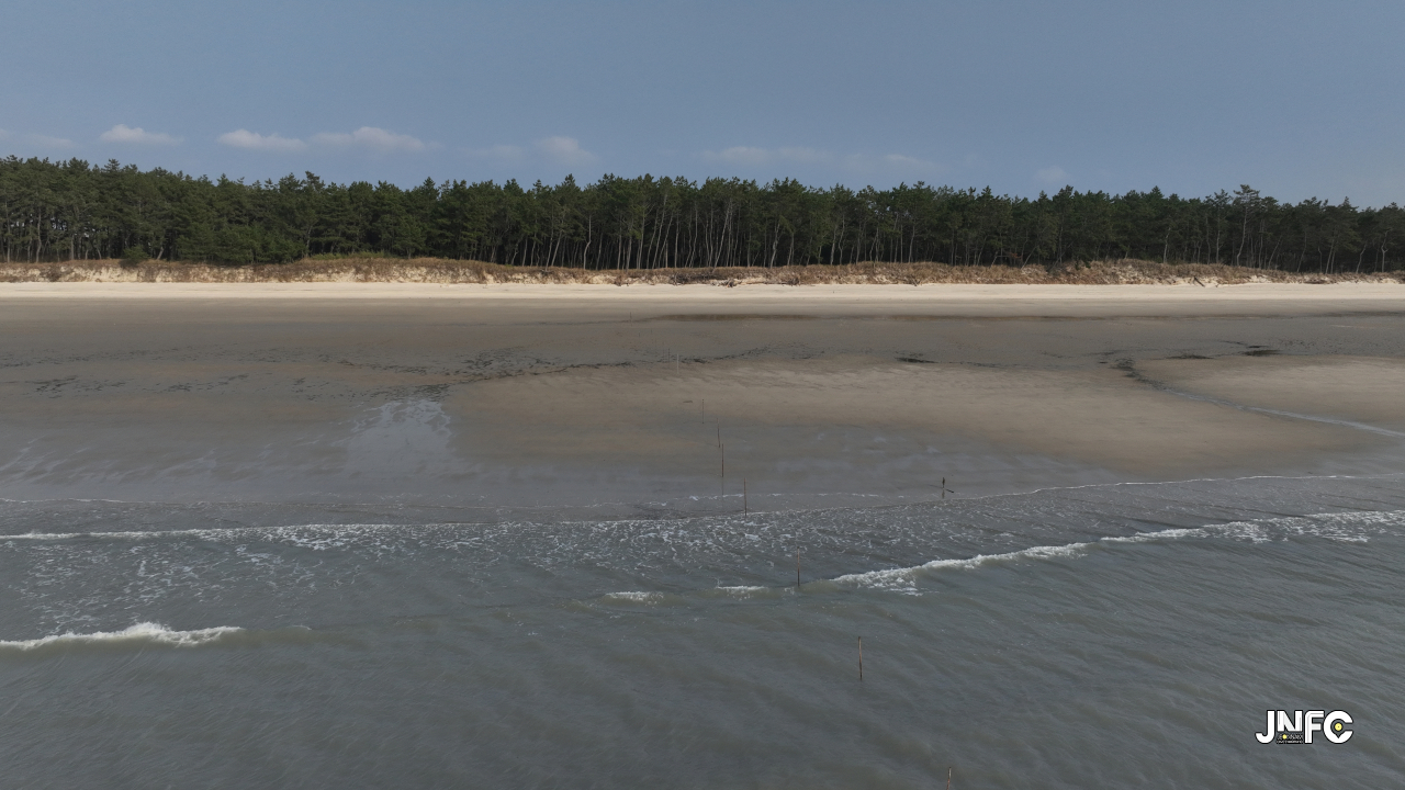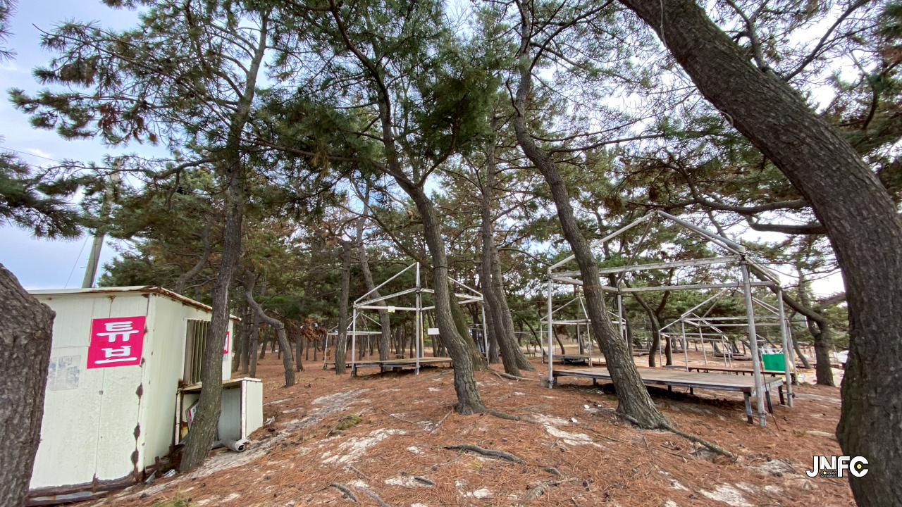 하얀 모래사장이 길게 늘어져 있고 뒷편으로는 소나무가 방풍림으로 조성이 되어 있다.