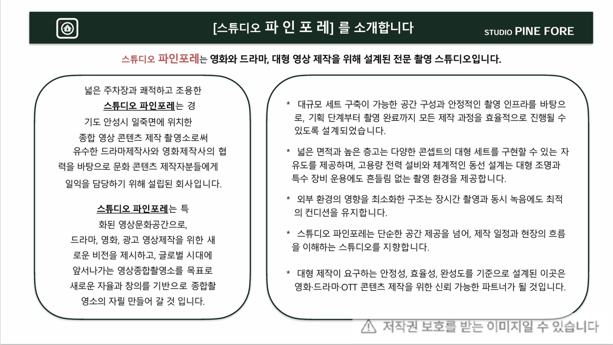 스튜디오파인포레는 특화된 영상문화공간으로 새로운 비전을 제시하고 글로벌시대에 앞서나가는 영상종합촬영소를 목표로