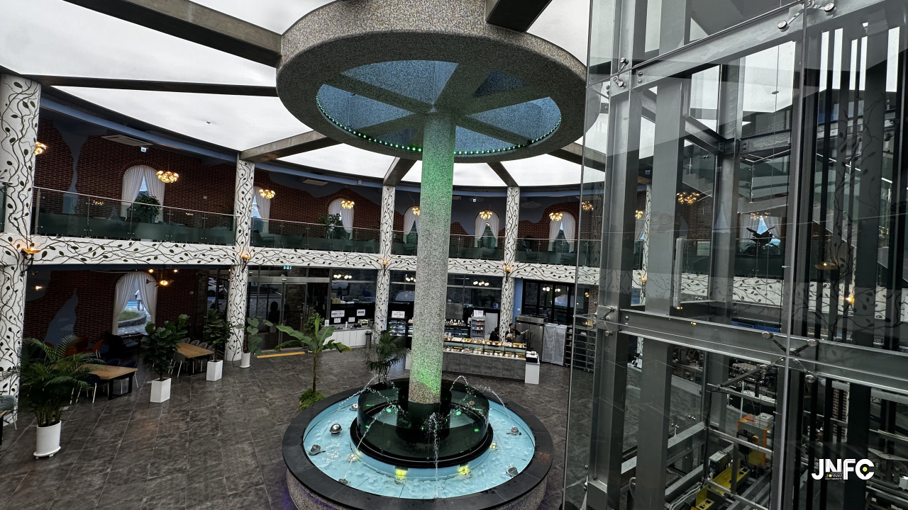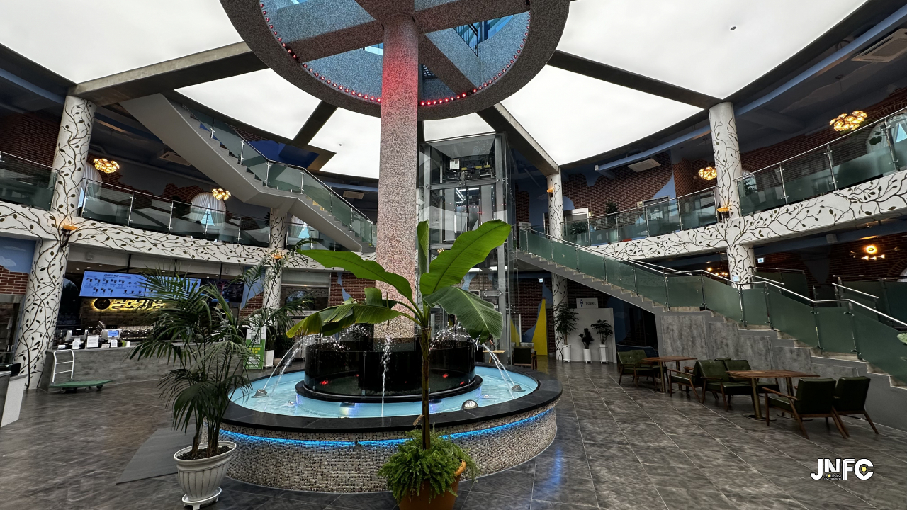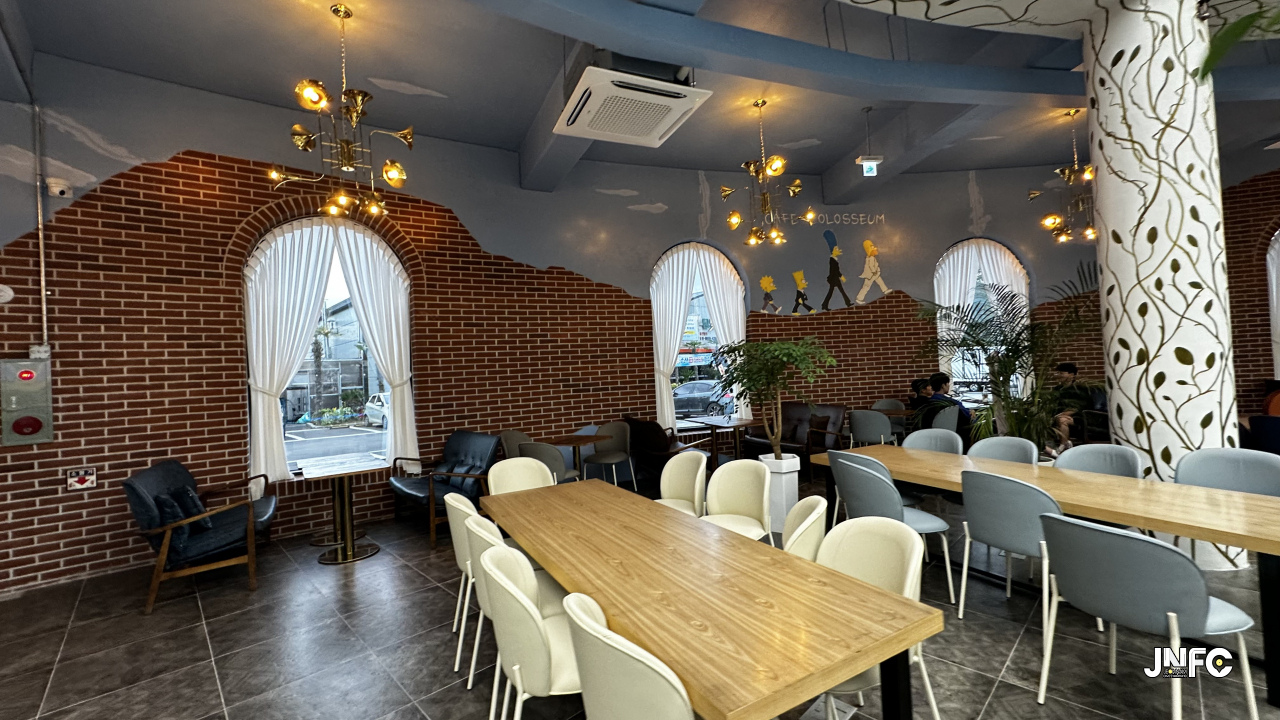 아치·컬럼이 돋보이는 테마형 외관. 패션·브랜디드·SNS 톤 연출 용이하다 아치 프레임 워킹, 라테 아트 탑샷, 테라스 와이드, 네온 사인 나이트 컷도 촬영이 가능하다