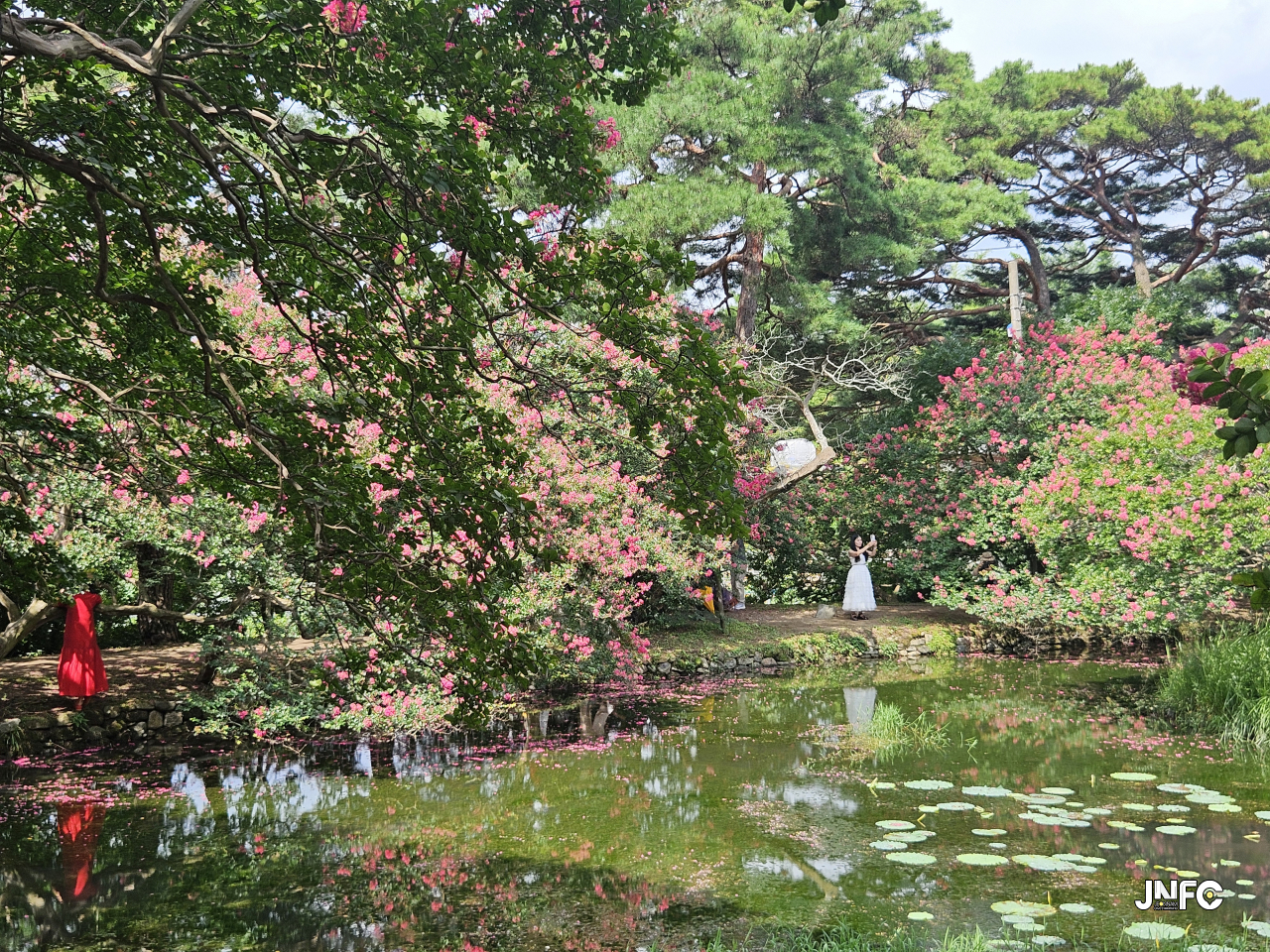 연못 수면 반사 실루엣, 정자 기둥 사이 액자 구도, 소나무 틸트, 한복 워킹 샷을 찍기에 좋다.