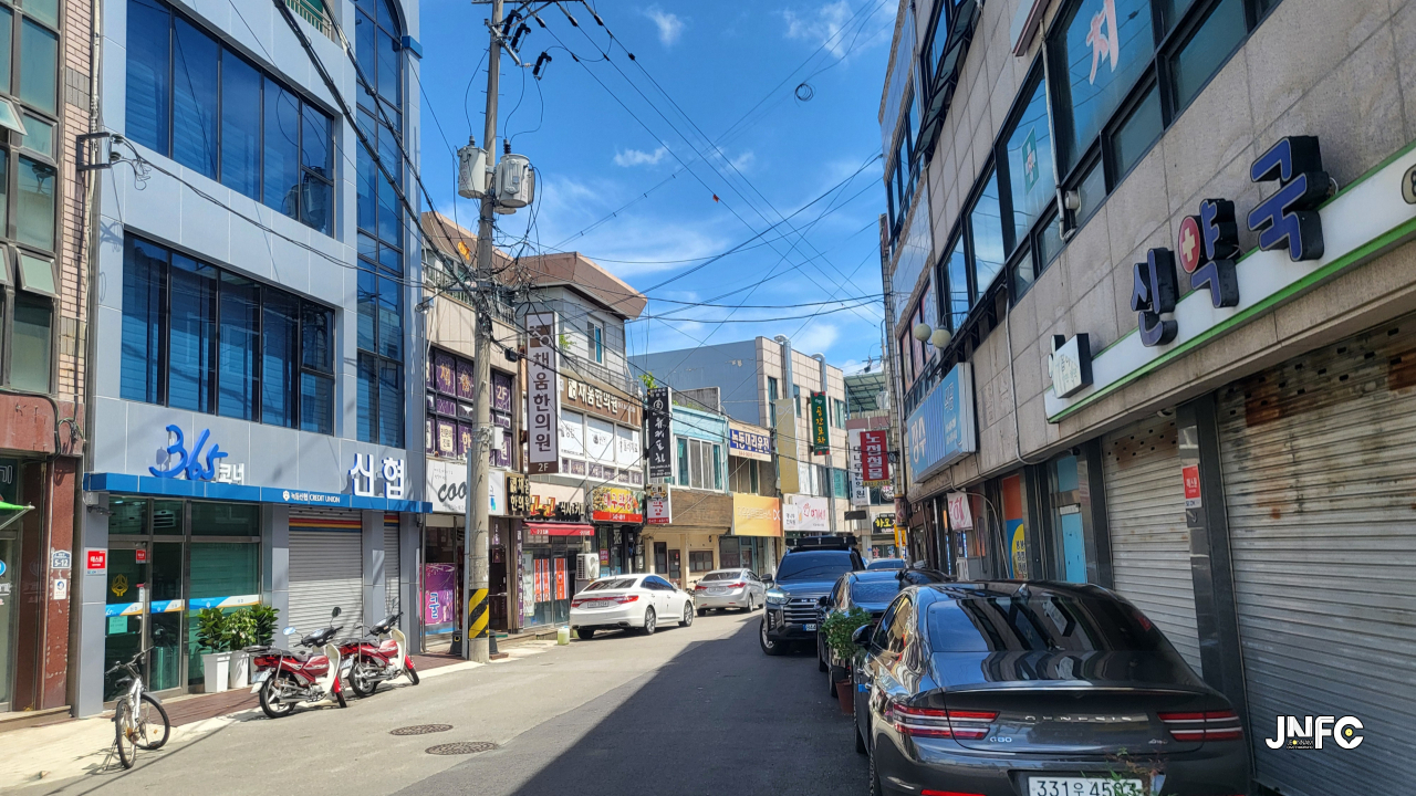 건물마다 다른 색감으로 페인팅되어 이탈리아 항구느낌이 나는 항구 주변 거리 모습이다.