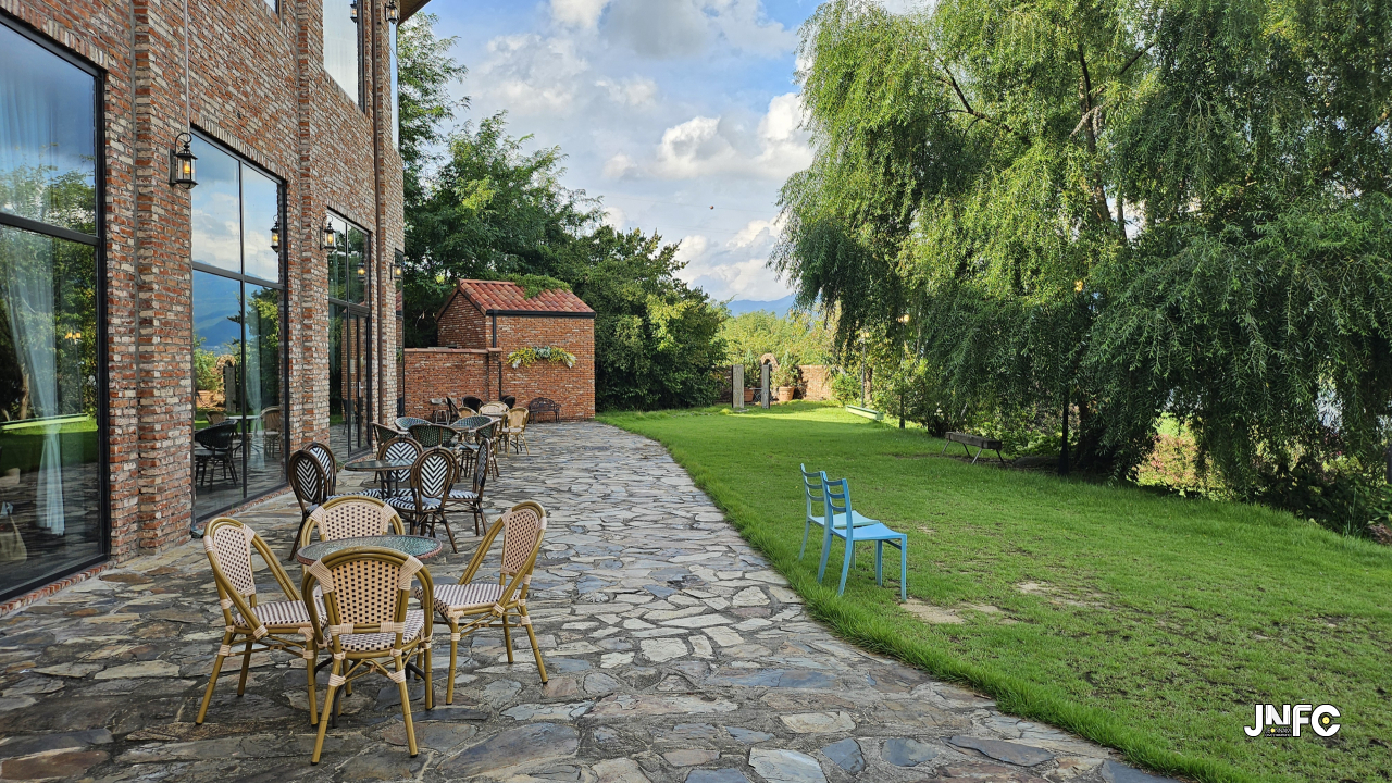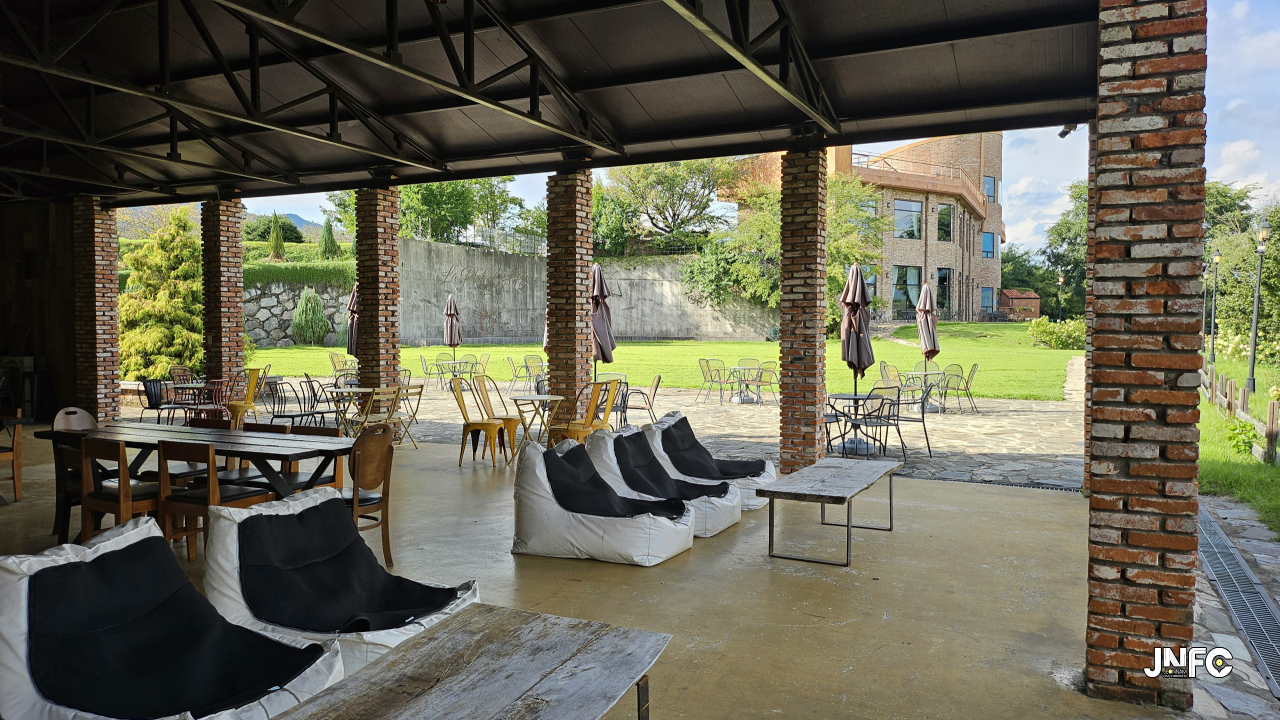 테라스 옆에는 넓은 잔디밭이 있으며 건물 하나가 더 위치 해 있는데 야외 책상과 , 빈백에 앉을 수 있다.