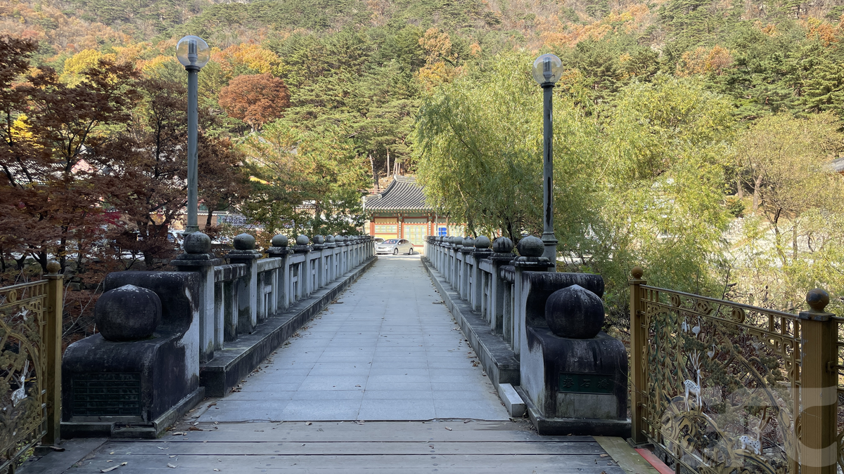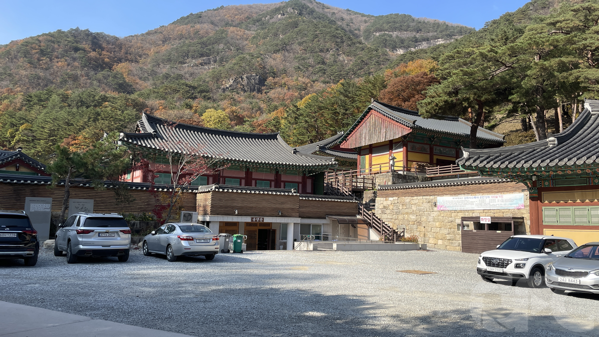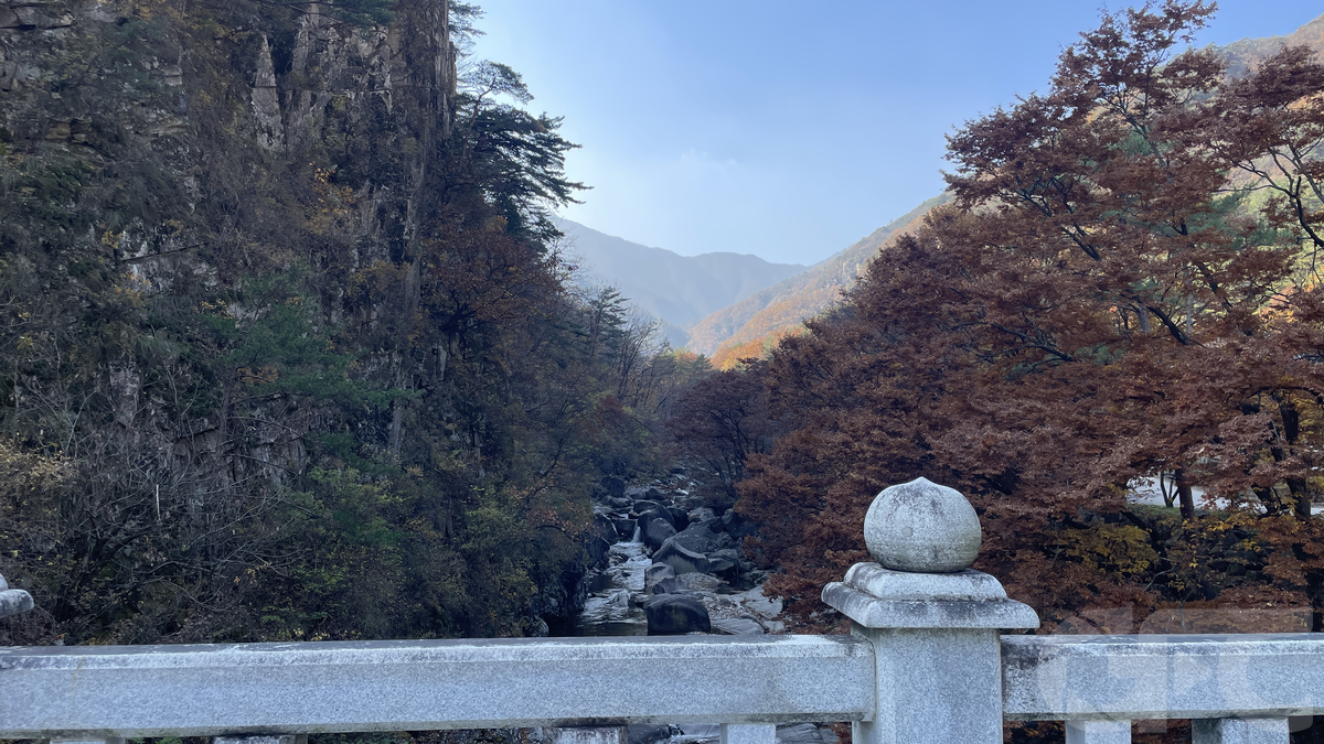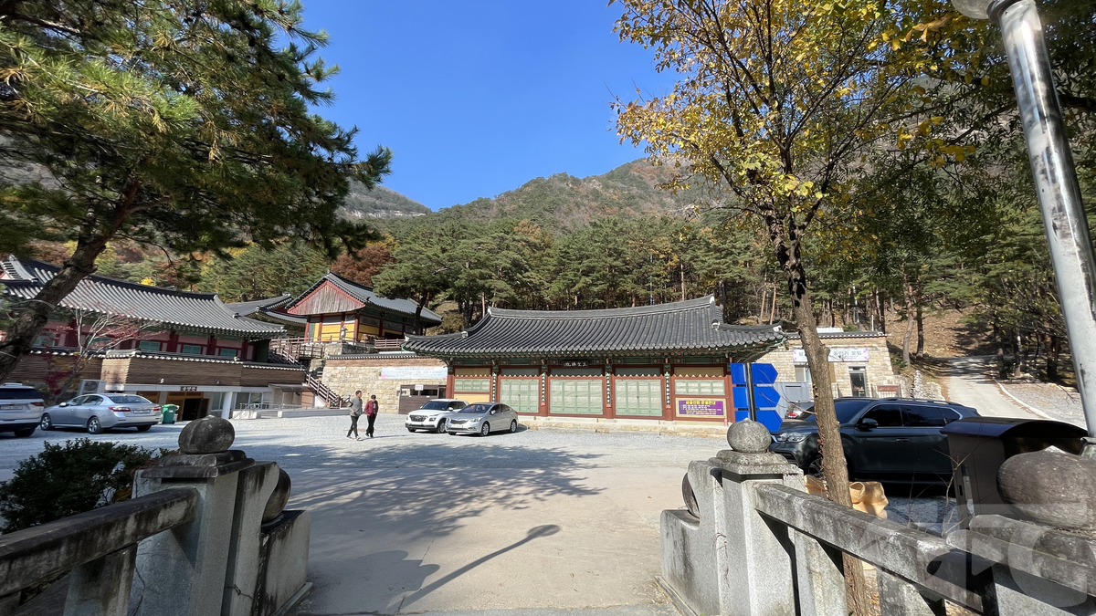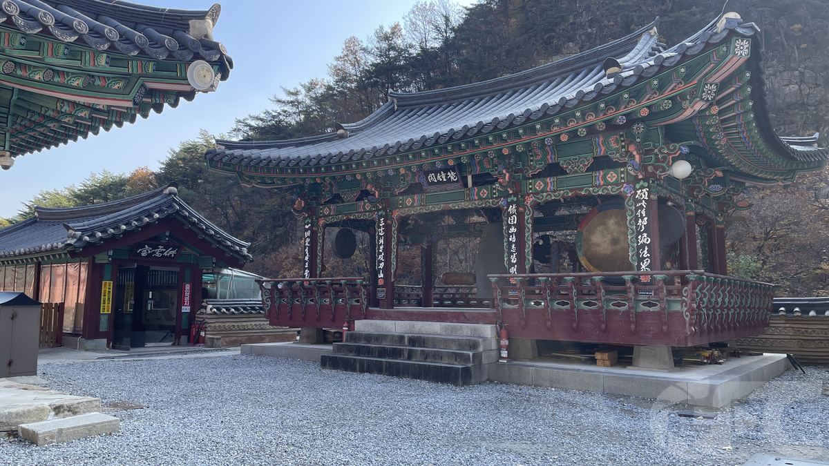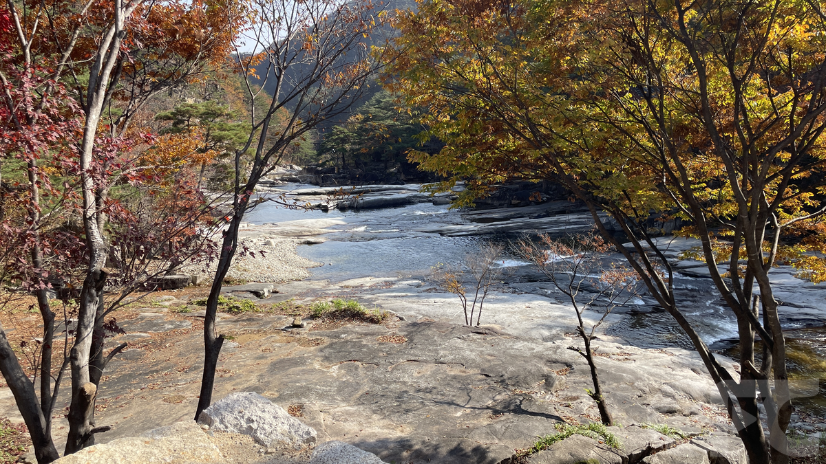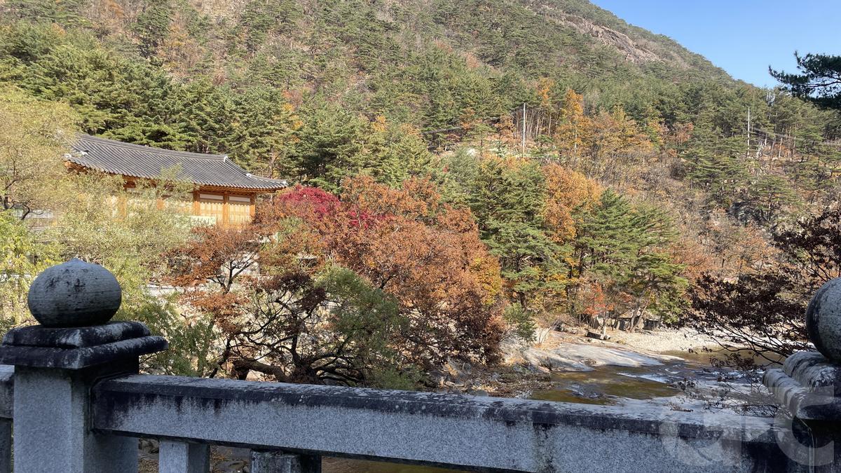 뒤로는 산이 배경이 되고 앞으로는 무릉계곡의 물이 흘러 빼어난 풍경을 보여준다.