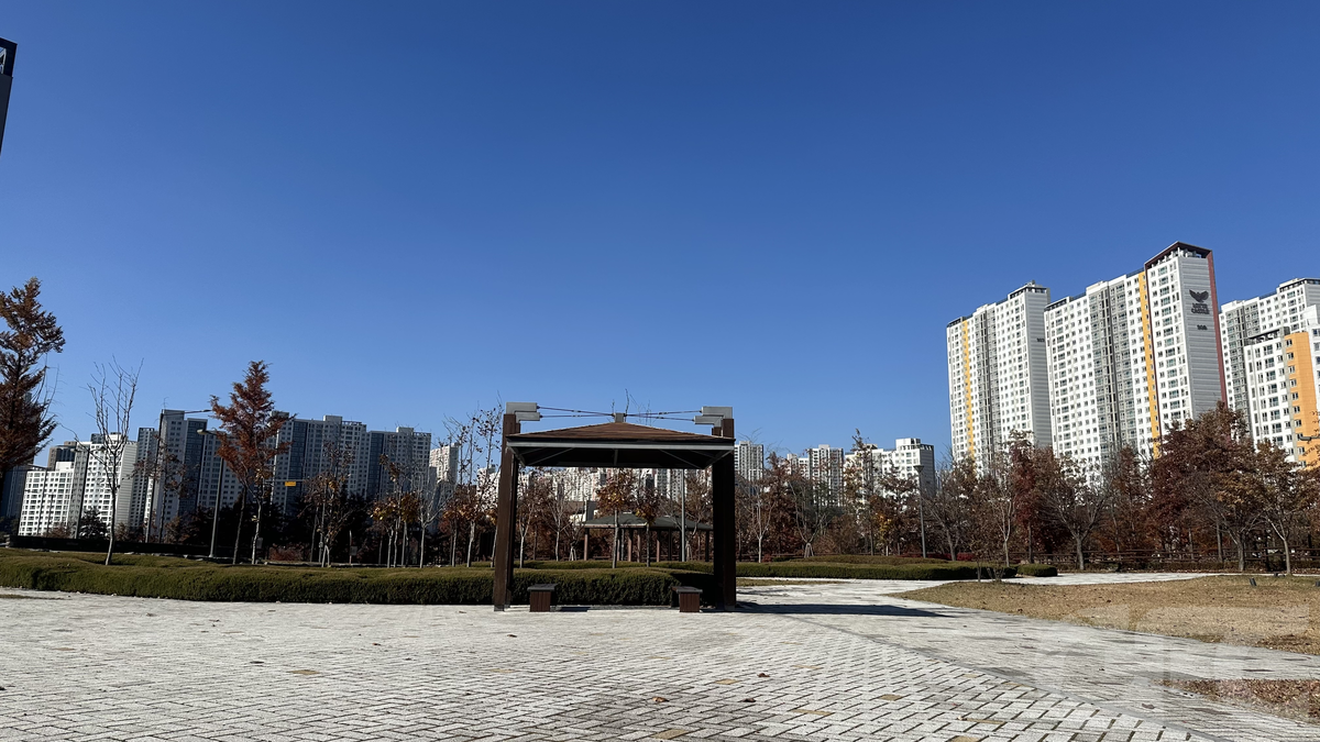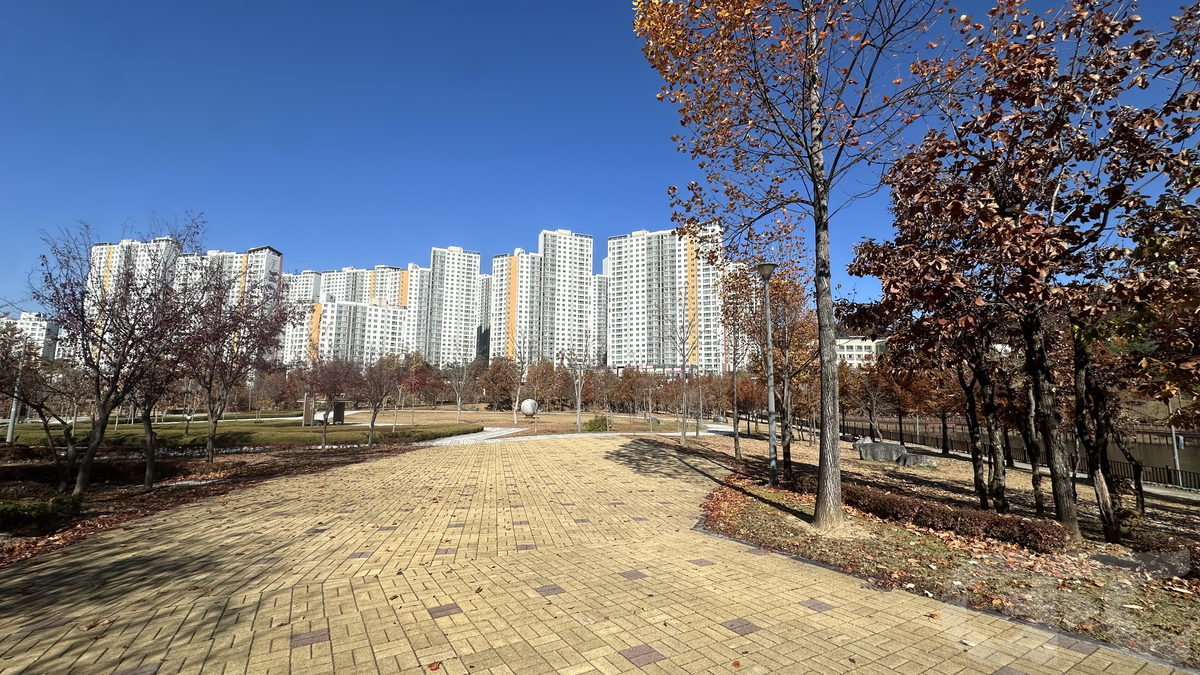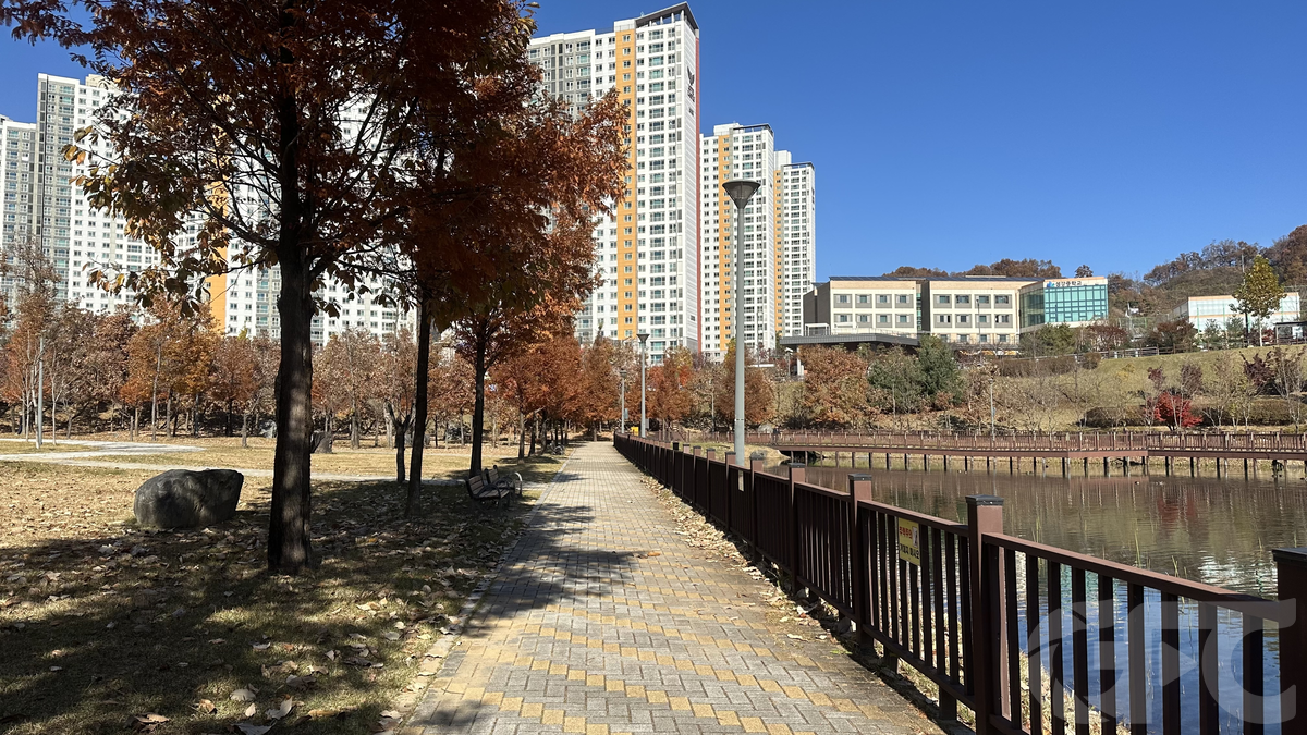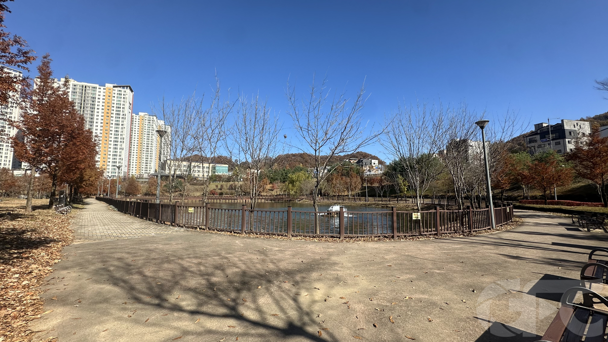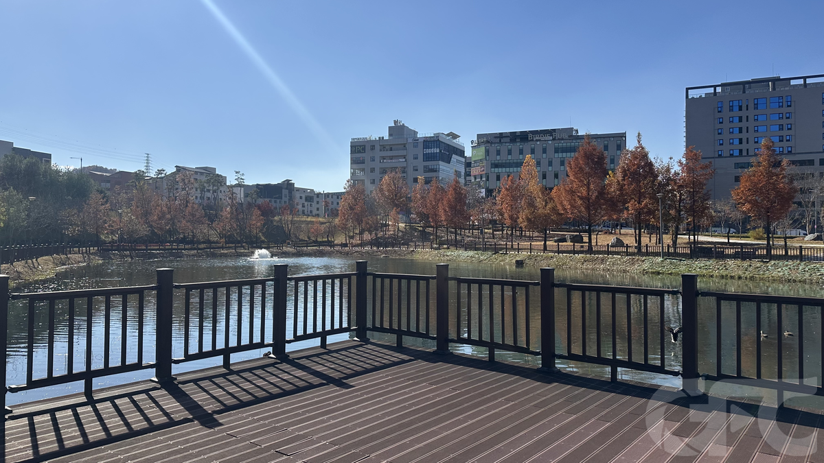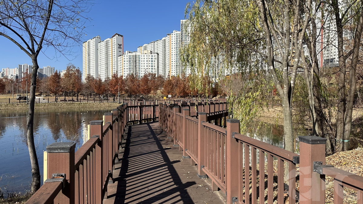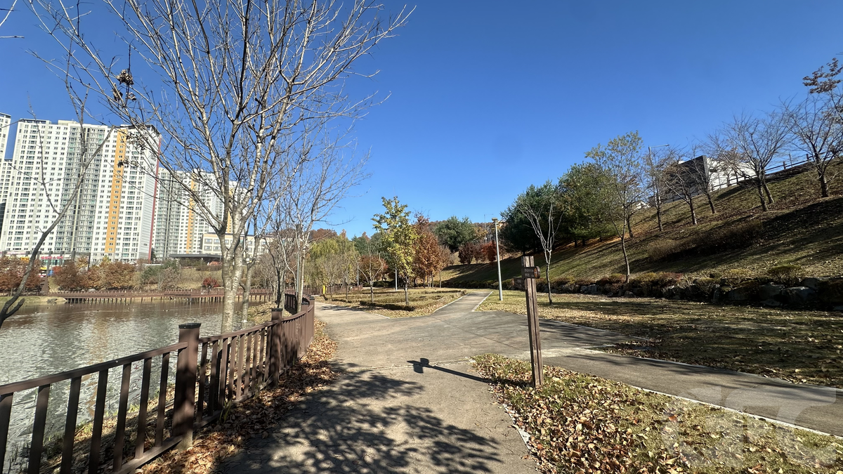 넓게 조성된 인공호수 ‘거울못’을 중심으로 산책로, 수변 데크, 잔디광장 등이 단정하고 현대적으로 배치됨.