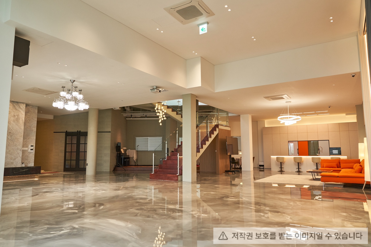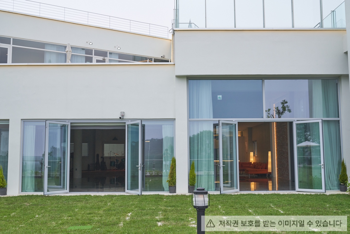 1층은 실내 공간 100평과 실외 공간 200평 규모로, 실내공간은 다양한 컨셉을 연출할 수 있는 리빙 공간과 층고가 높고 멋진 조명이 포인트인 공간이 어우러져 있어 활용도가 매우 높습니다. 그리고 한편에는 고급 음향시설, 노래방 기기와 악기 및 빔 스크린 2대가 설치되어 있어 이용 고객 누구나 자유롭게 이용할 수 있습니다. 또한 옷을 갈아입고 메이크업을 할 수 있는 탈의실이 갖춰져 있습니다. 야외 공간은 관리가 잘 된 푸르른 잔디가 깔려있고 가장자리에 있는 나무 데크에서는 멋진 임진강 뷰를 감상할 수 있습니다.