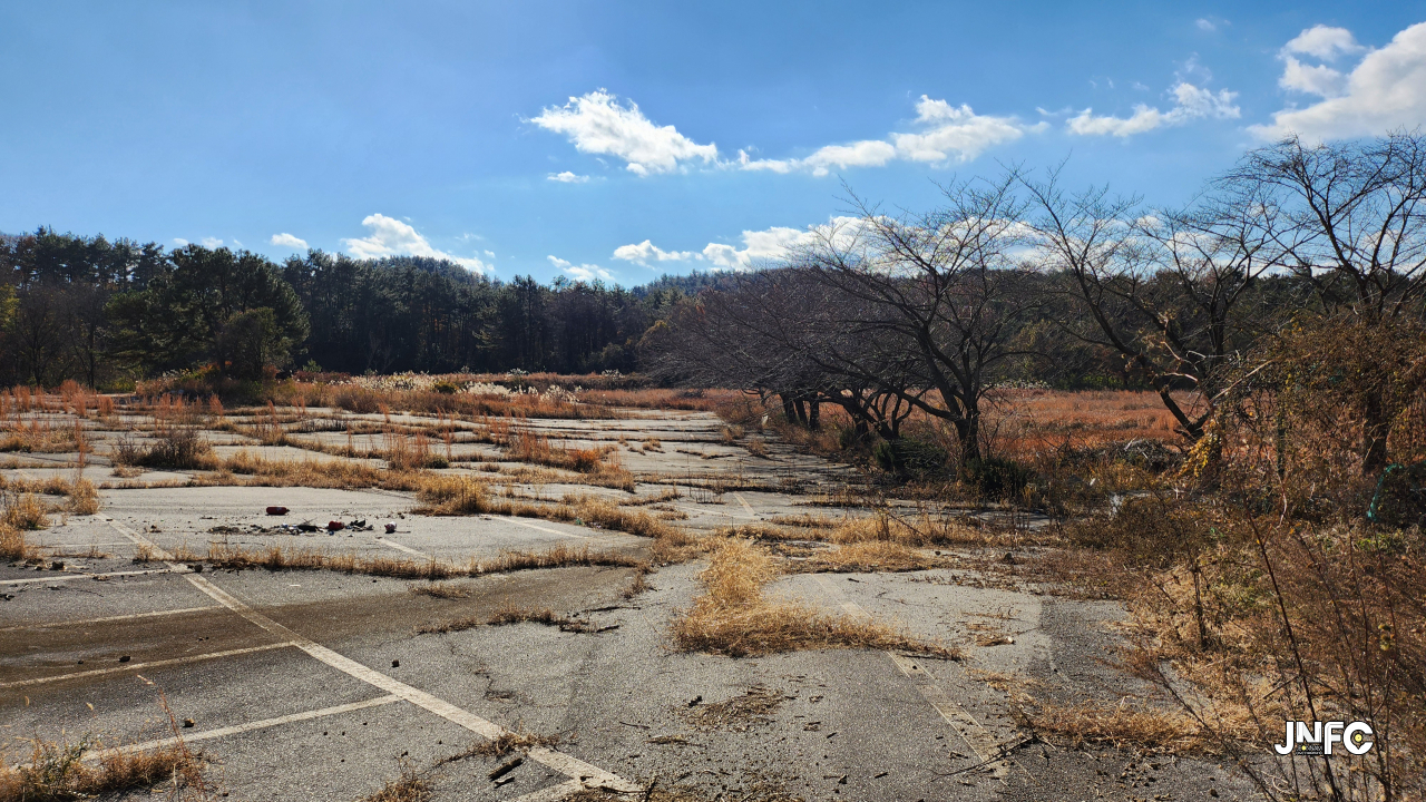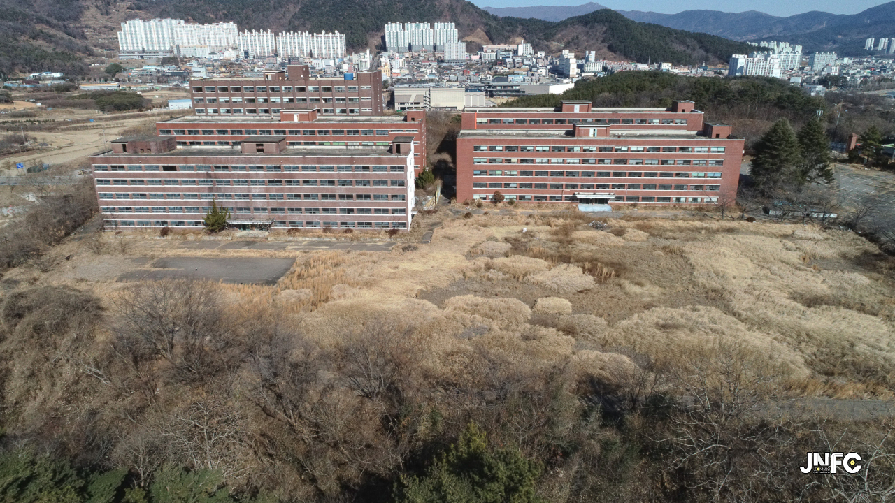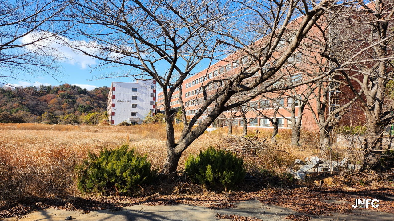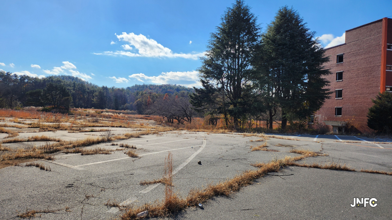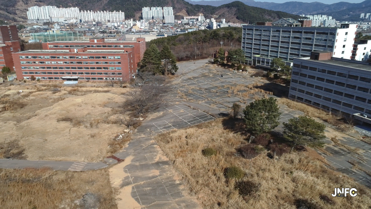 폐교된 대학교로 운동장엔 풀이 높게 자라있고, 주차장은 콘크리트가 깨져서 그 위로 풀이 덮혀있는 상태이다.