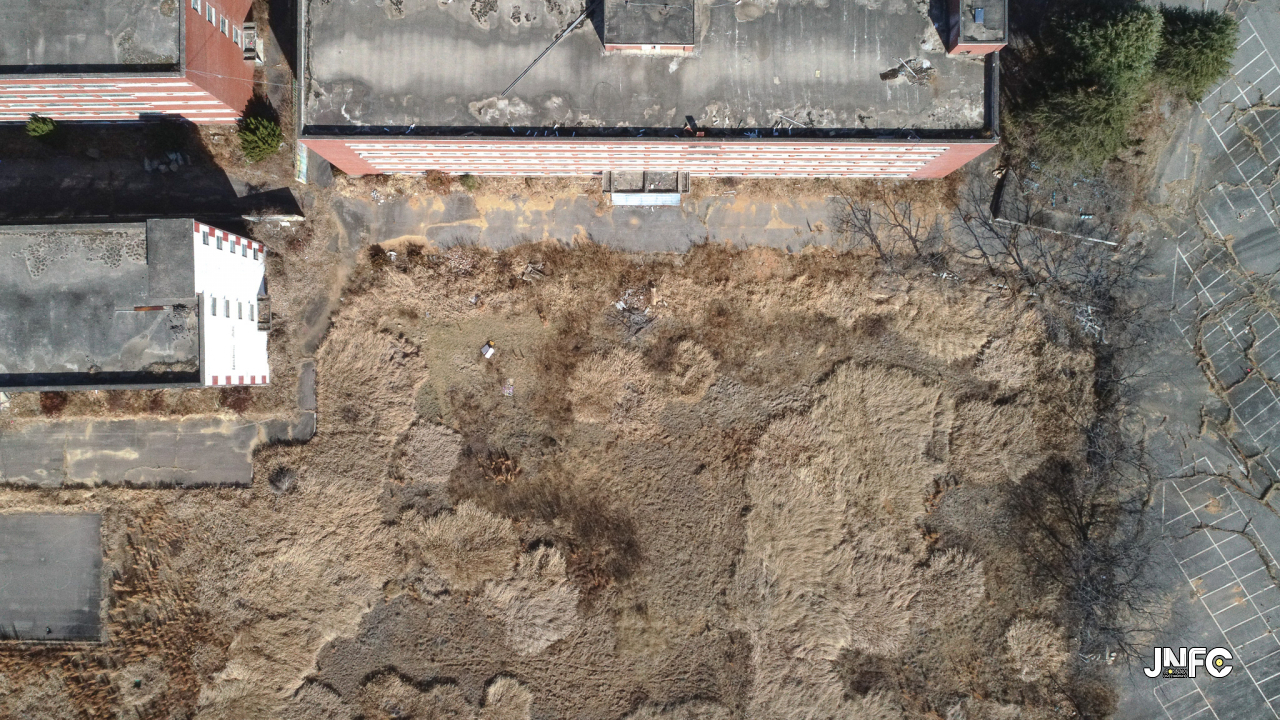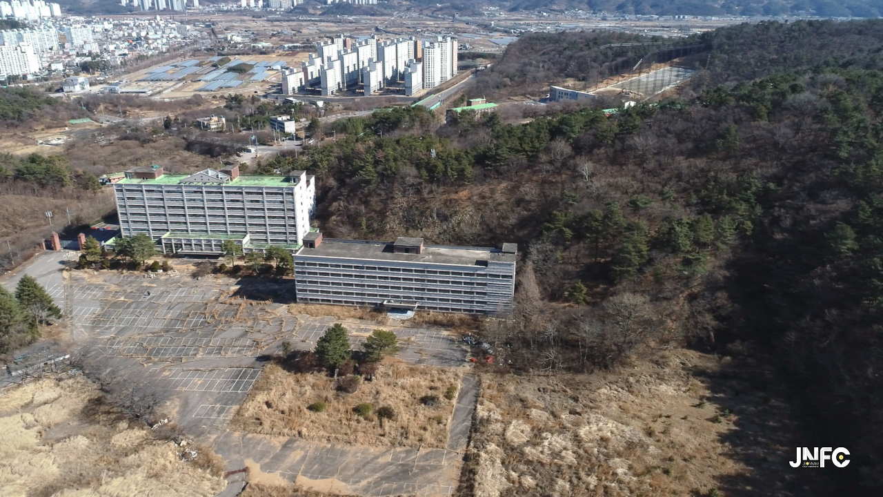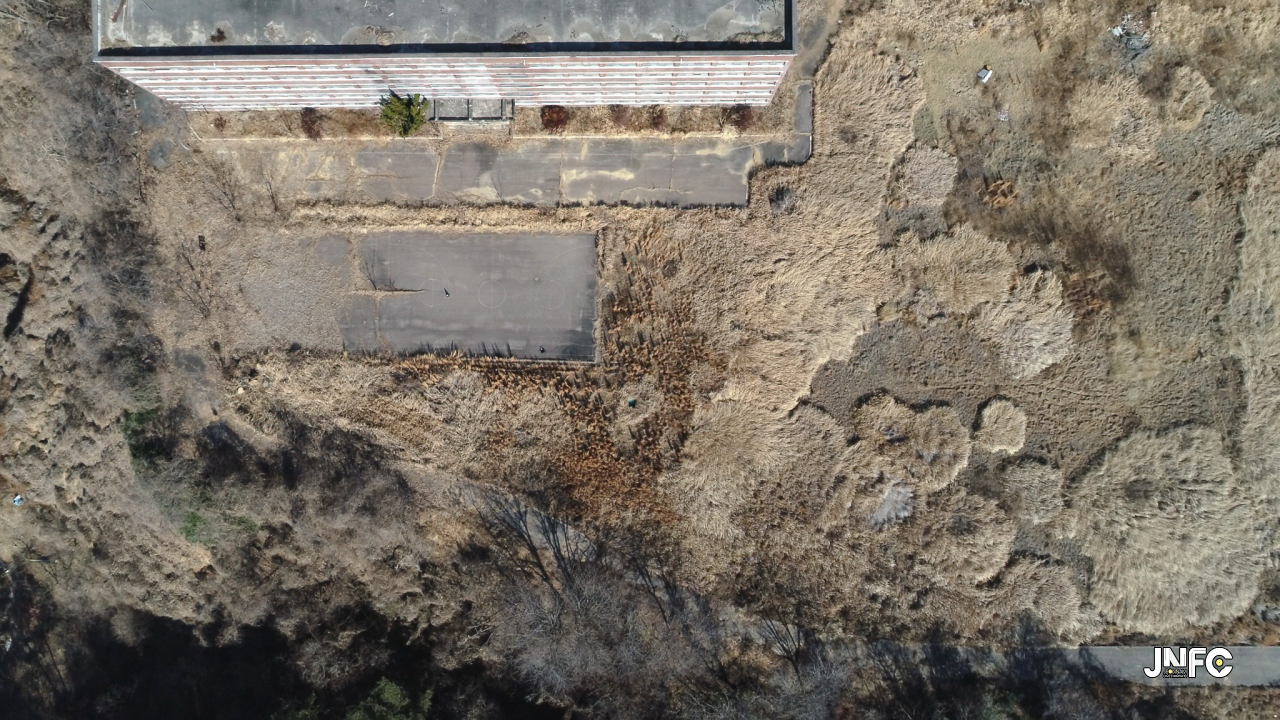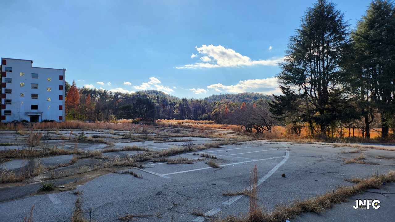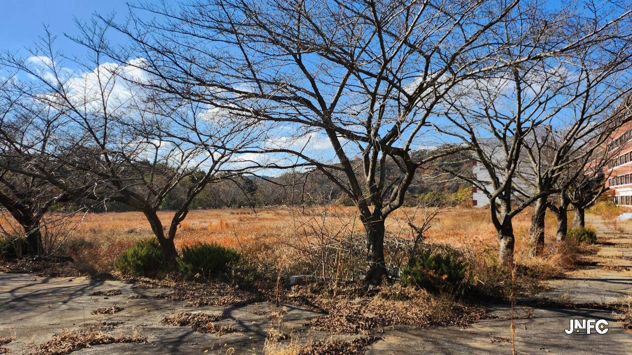 폐교된 대학교로 운동장엔 풀이 높게 자라있고, 주차장은 콘크리트가 깨져서 그 위로 풀이 덮혀있는 상태이다.