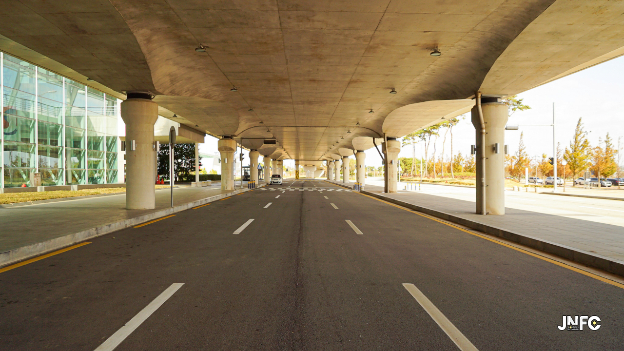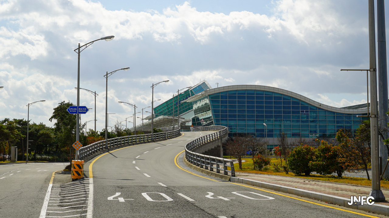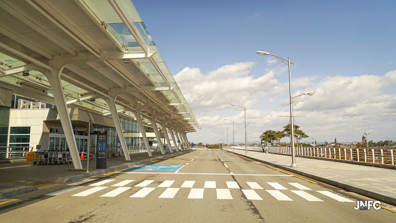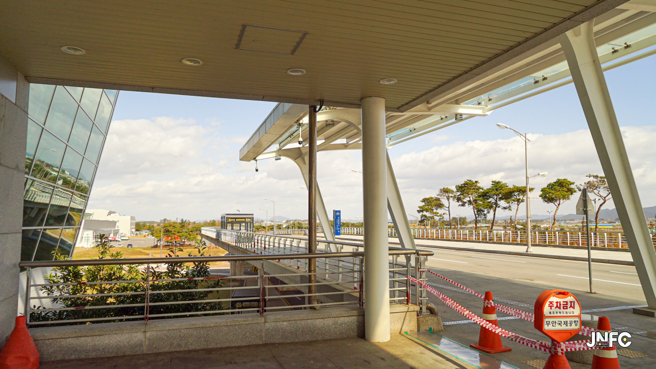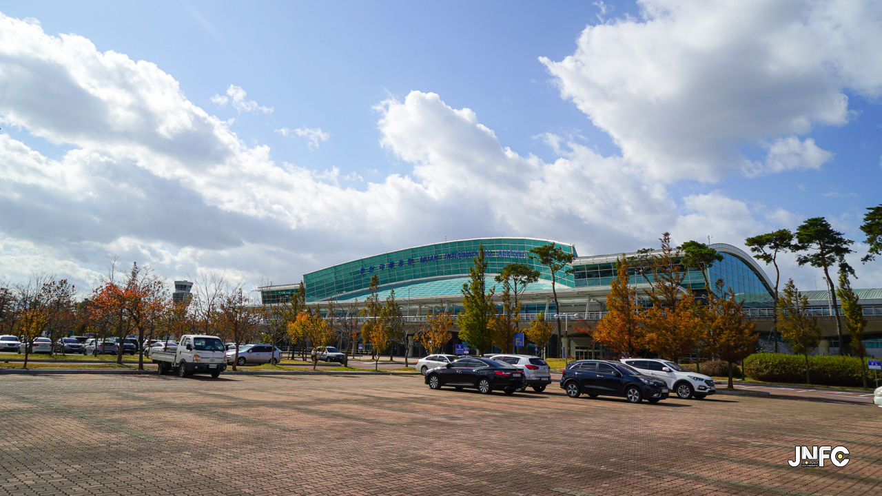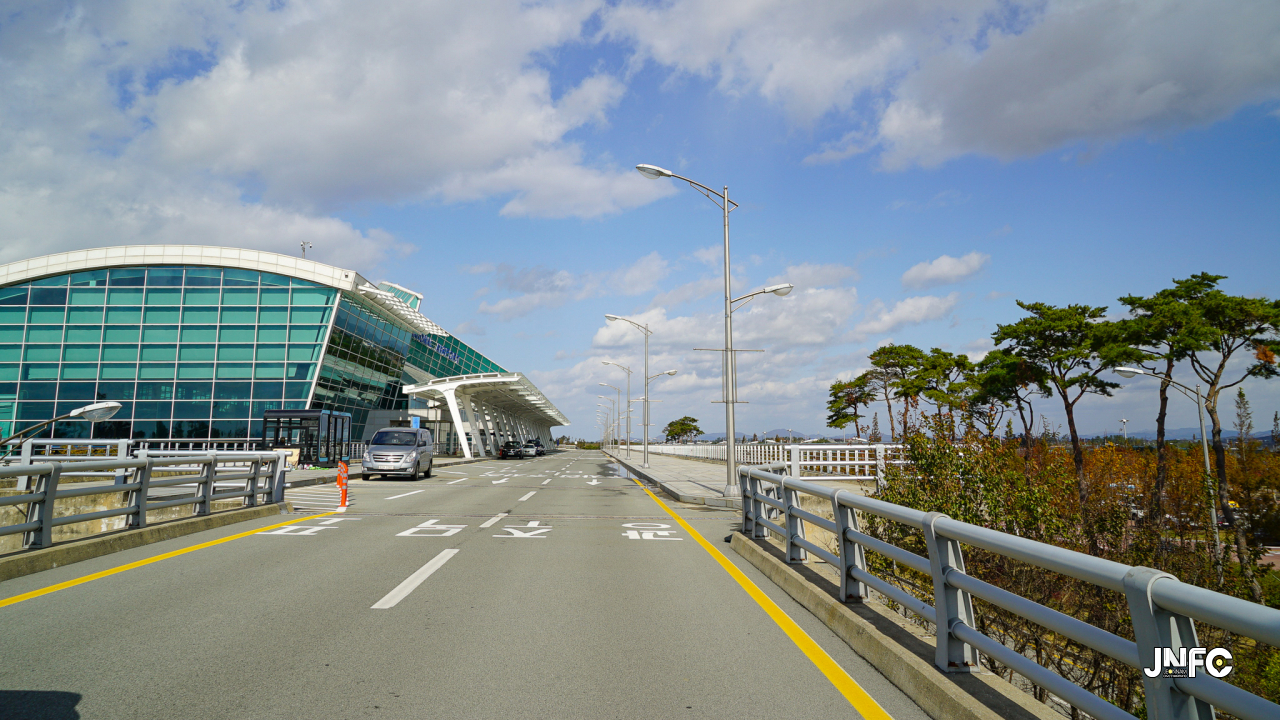 무안국제공항의 외경이다. 진입로, 주차장, 주변도로 이외에는 논밭이 펼쳐져 있다.