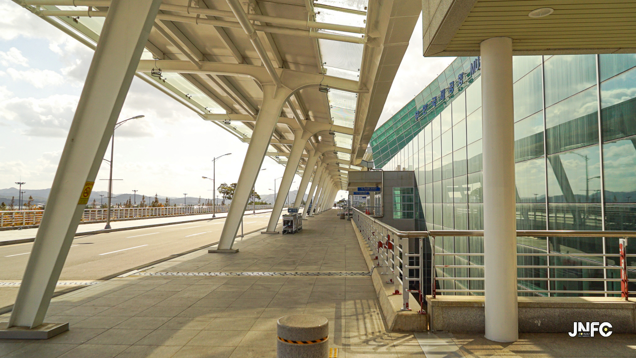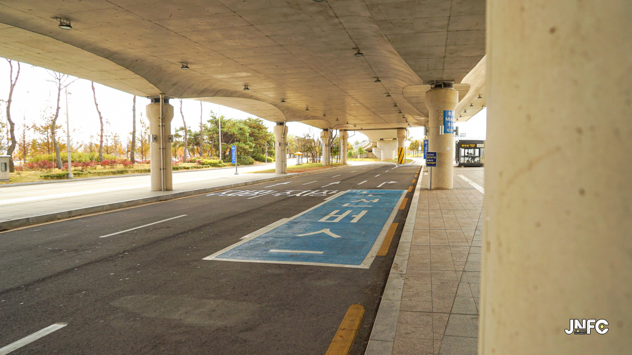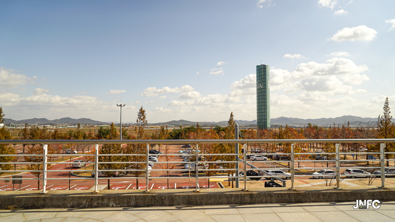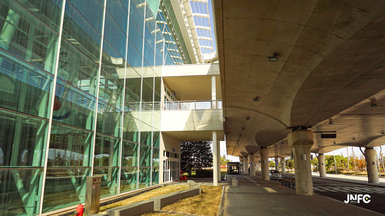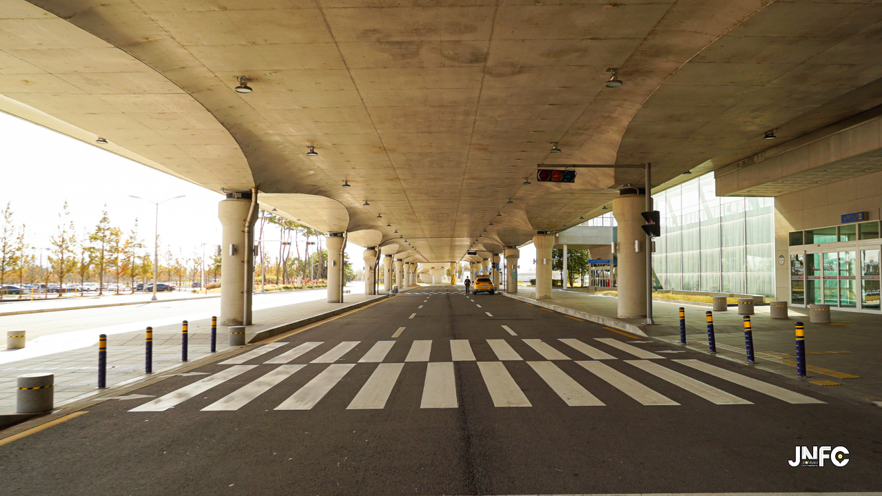 무안국제공항의 외경이다. 진입로, 주차장, 주변도로 이외에는 논밭이 펼쳐져 있다.