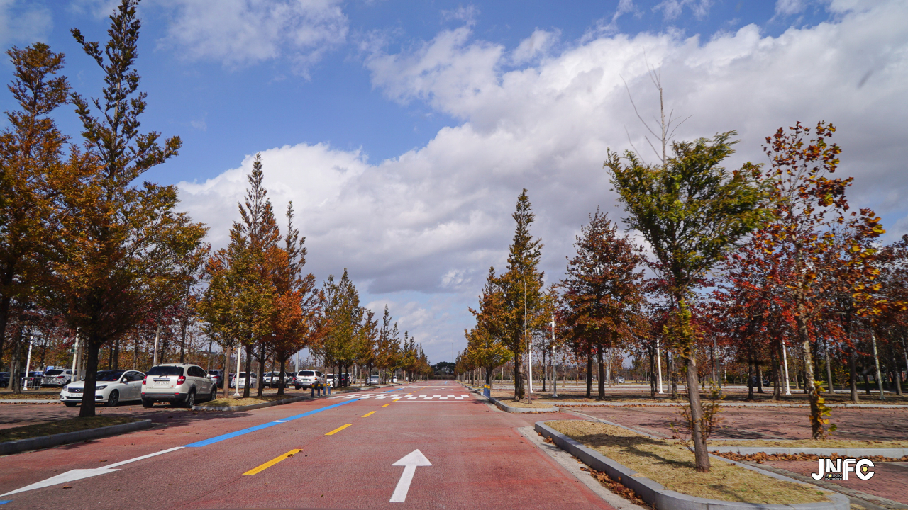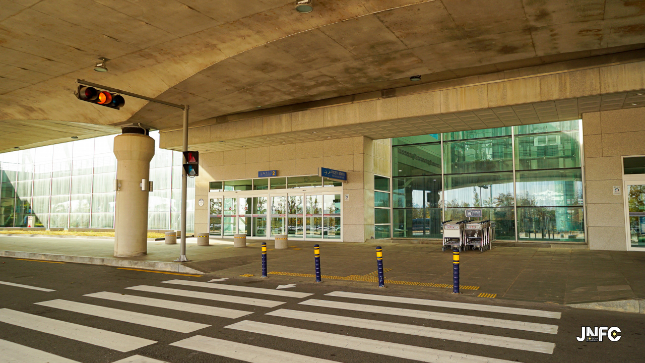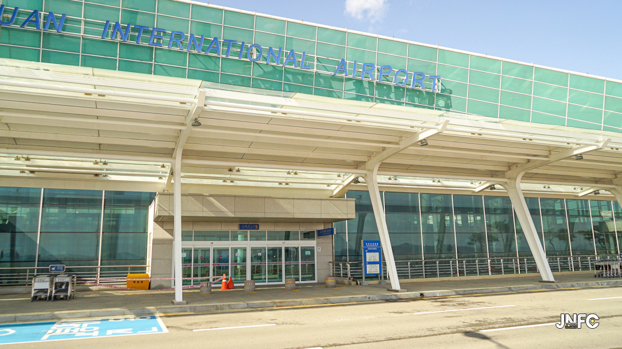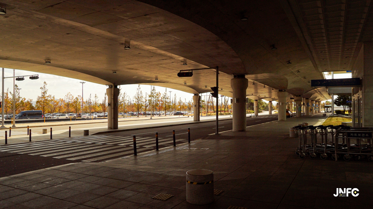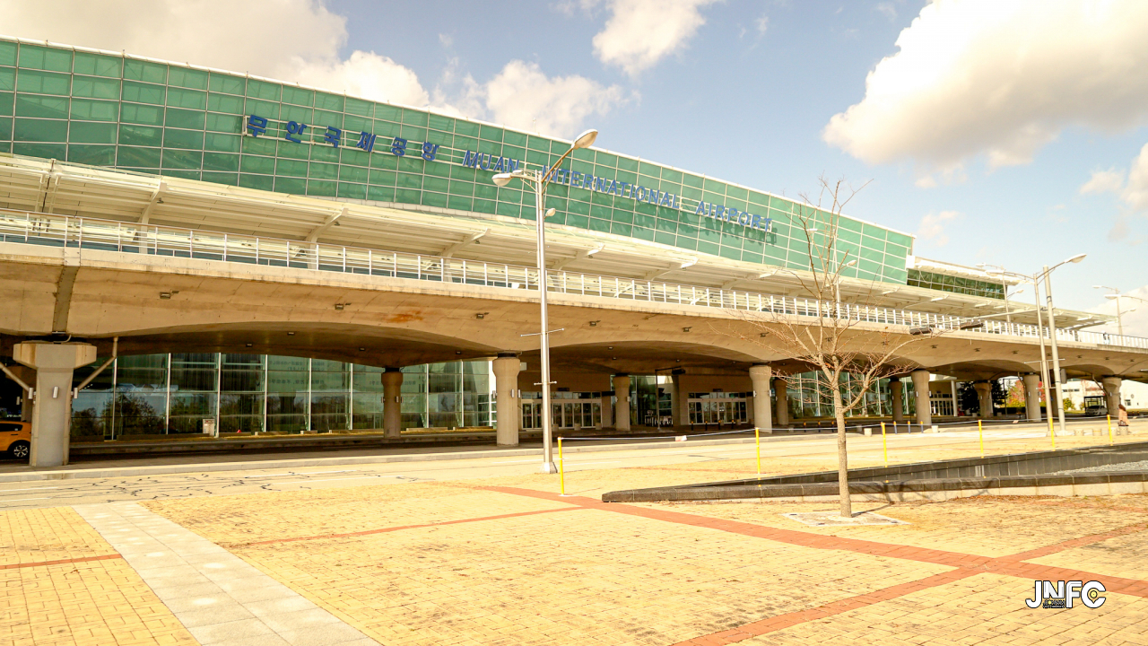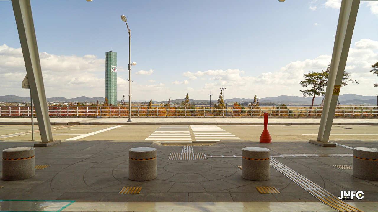 무안국제공항의 외경이다. 진입로, 주차장, 주변도로 이외에는 논밭이 펼쳐져 있다.
