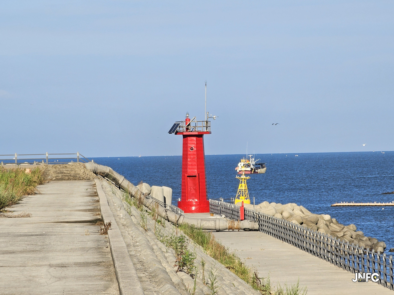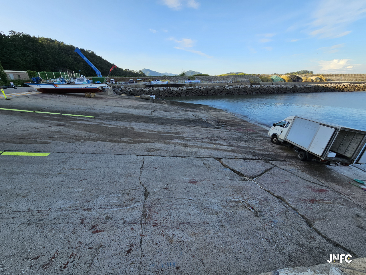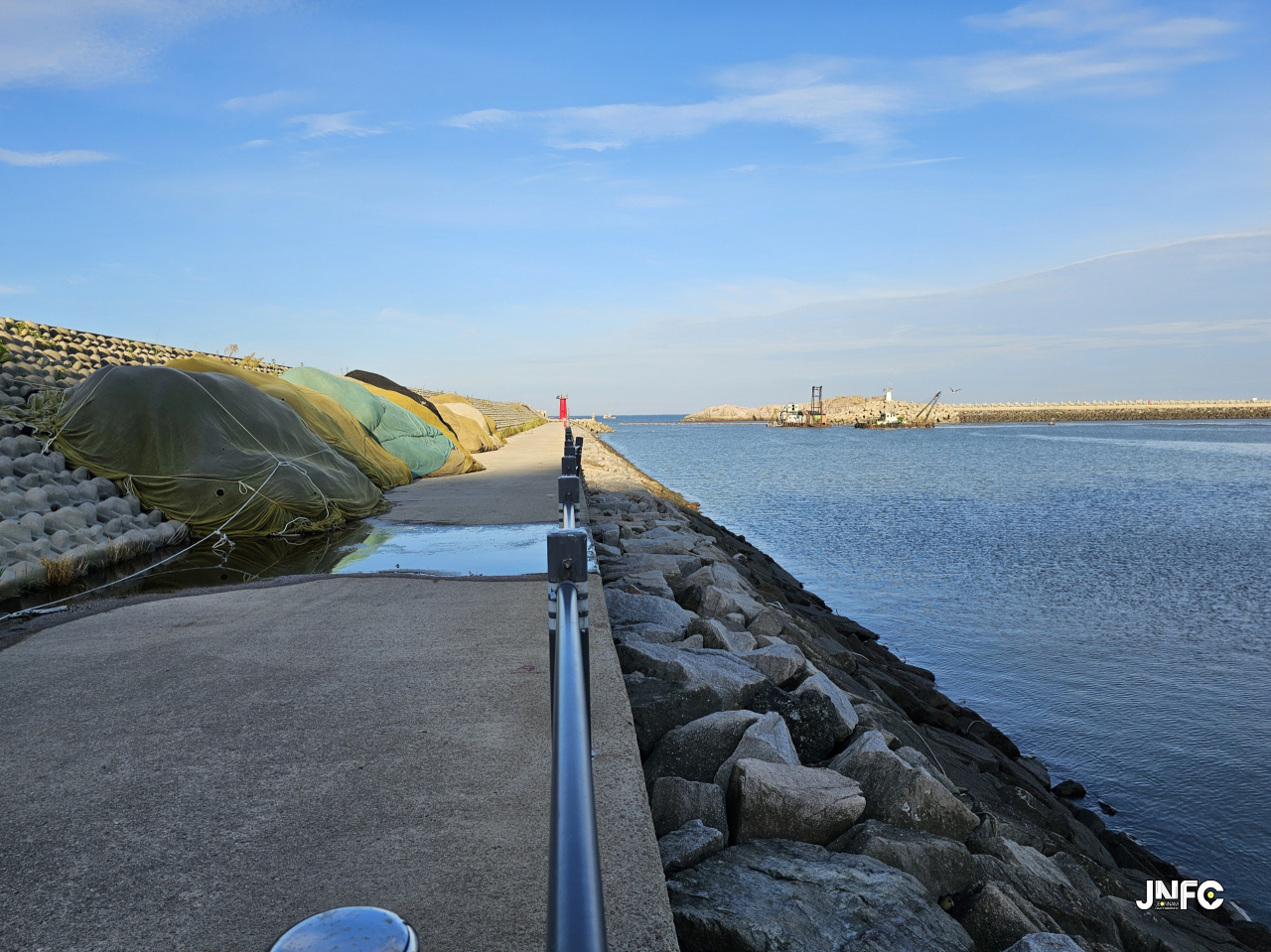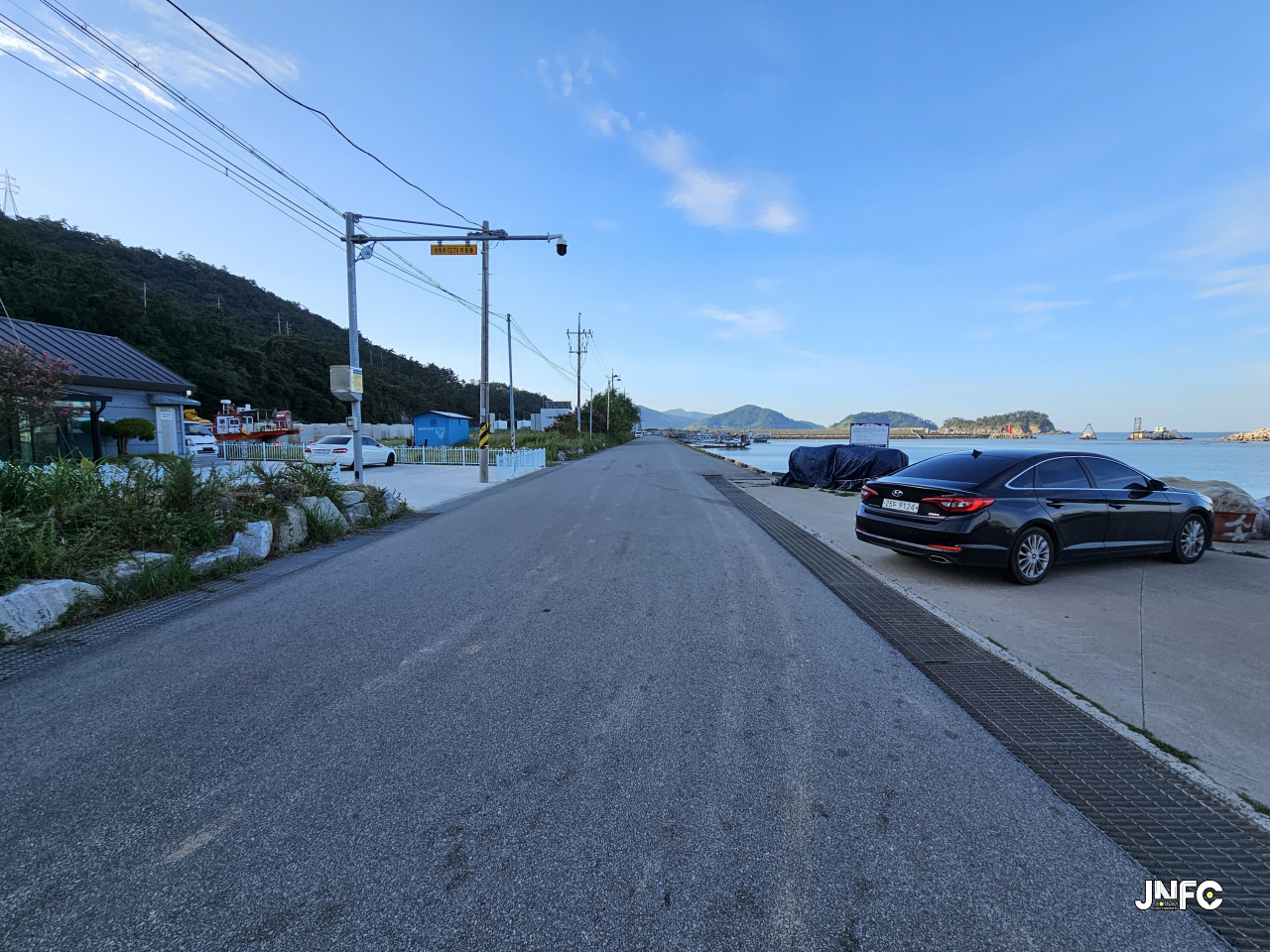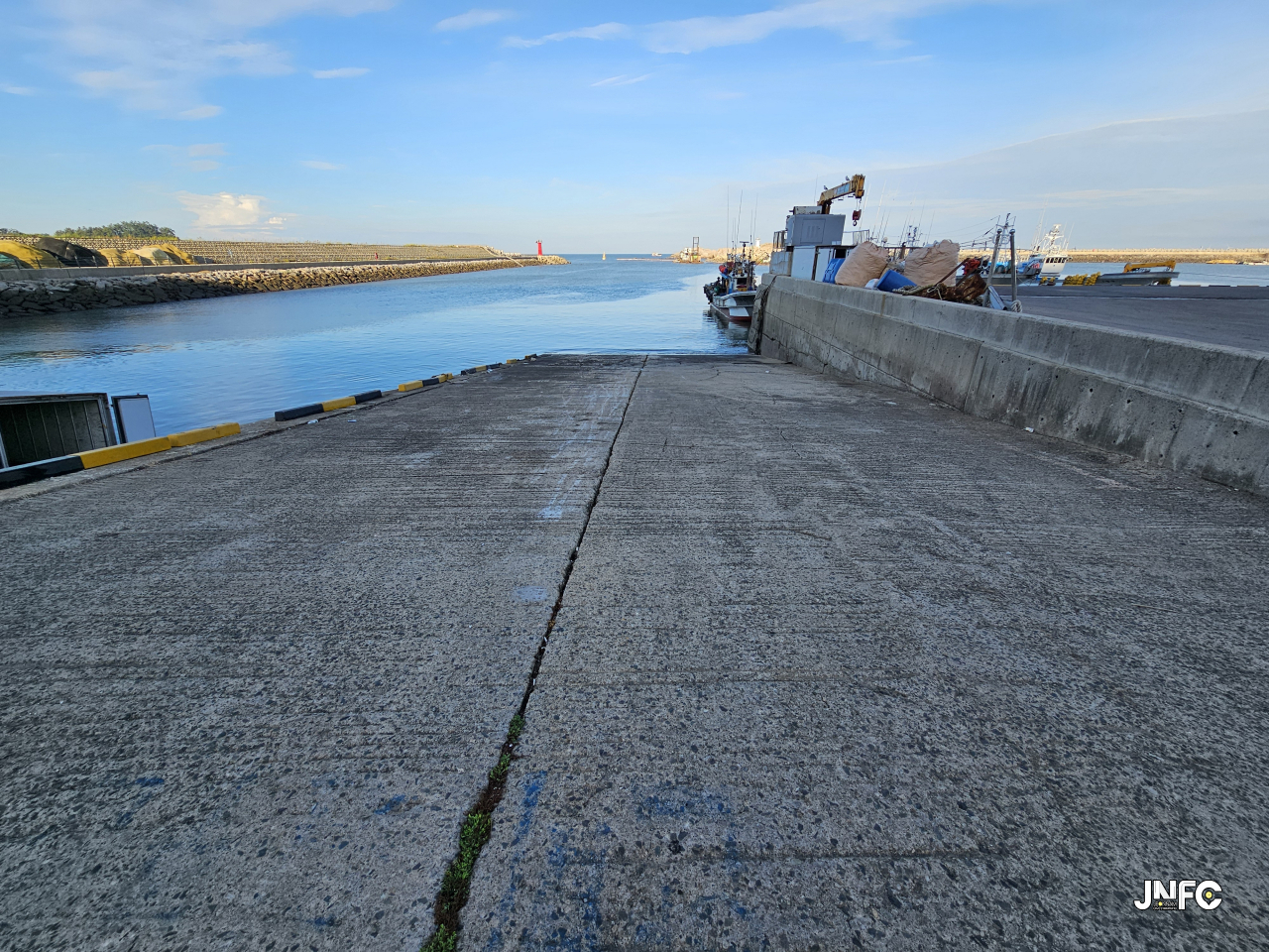 중소형 포구로 차량 주차가 용의하며 작은 빨간 등대가 있다.
