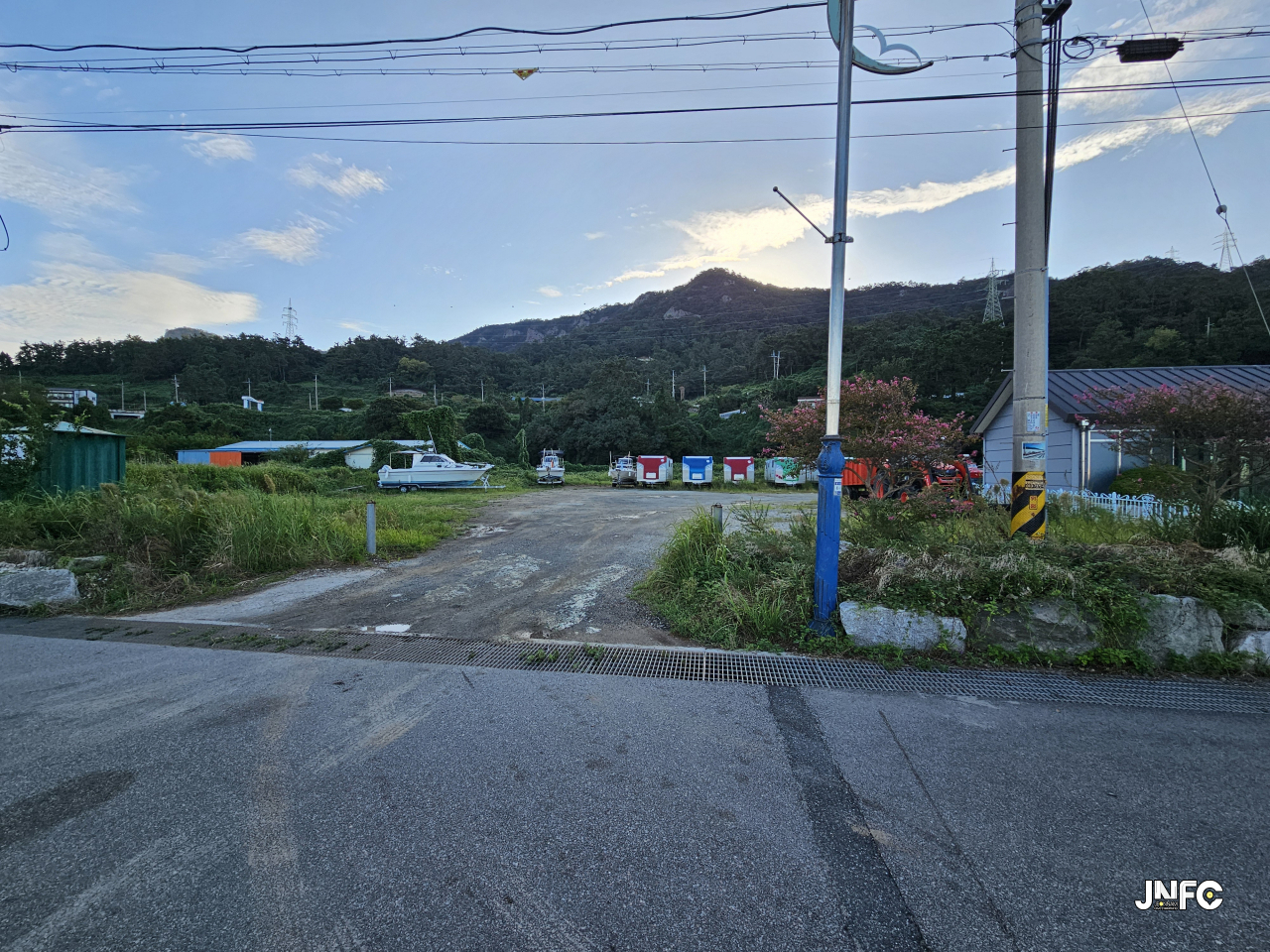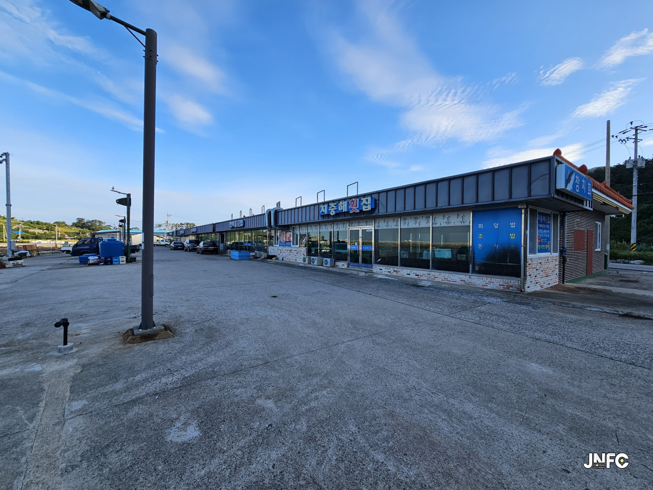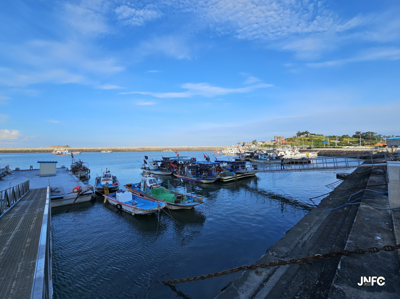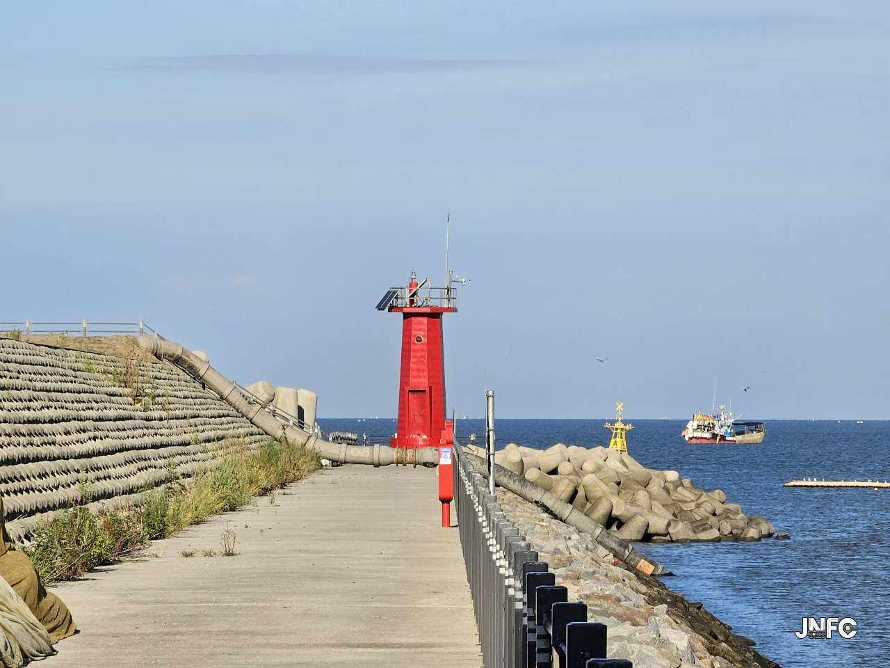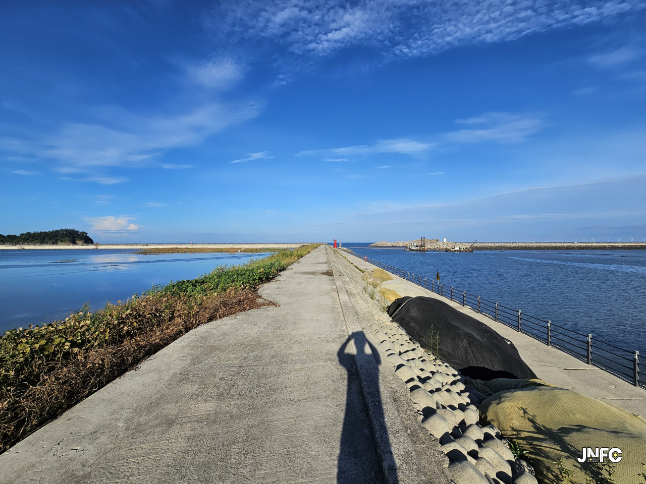 중소형 포구로 차량 주차가 용의하며 작은 빨간 등대가 있다.