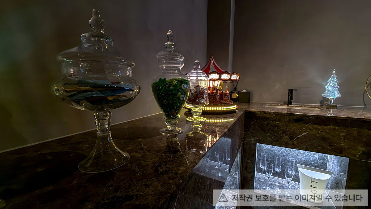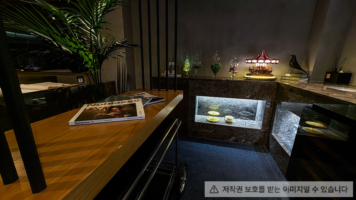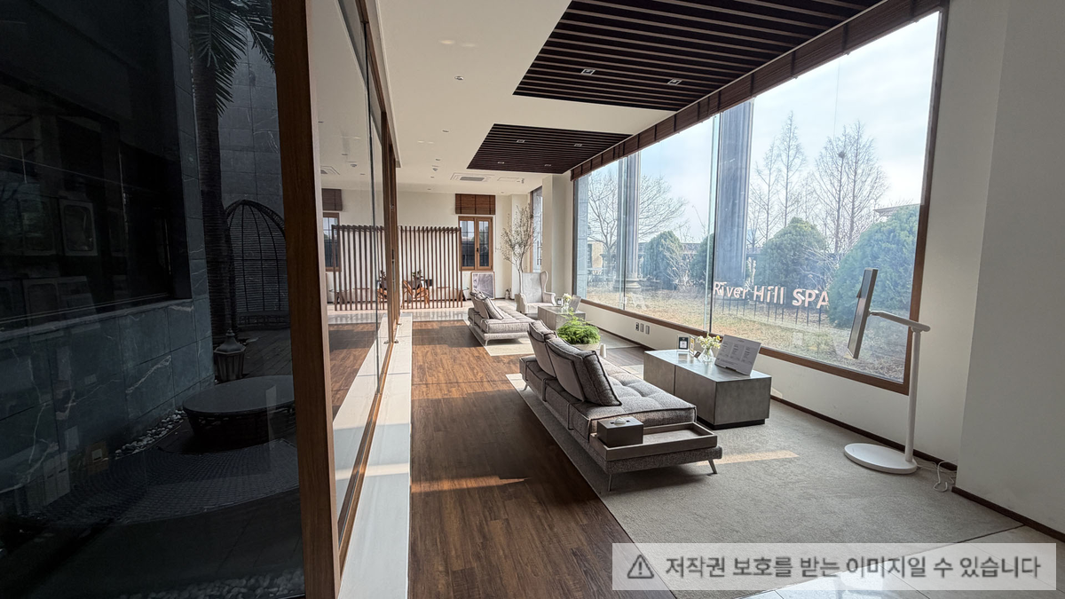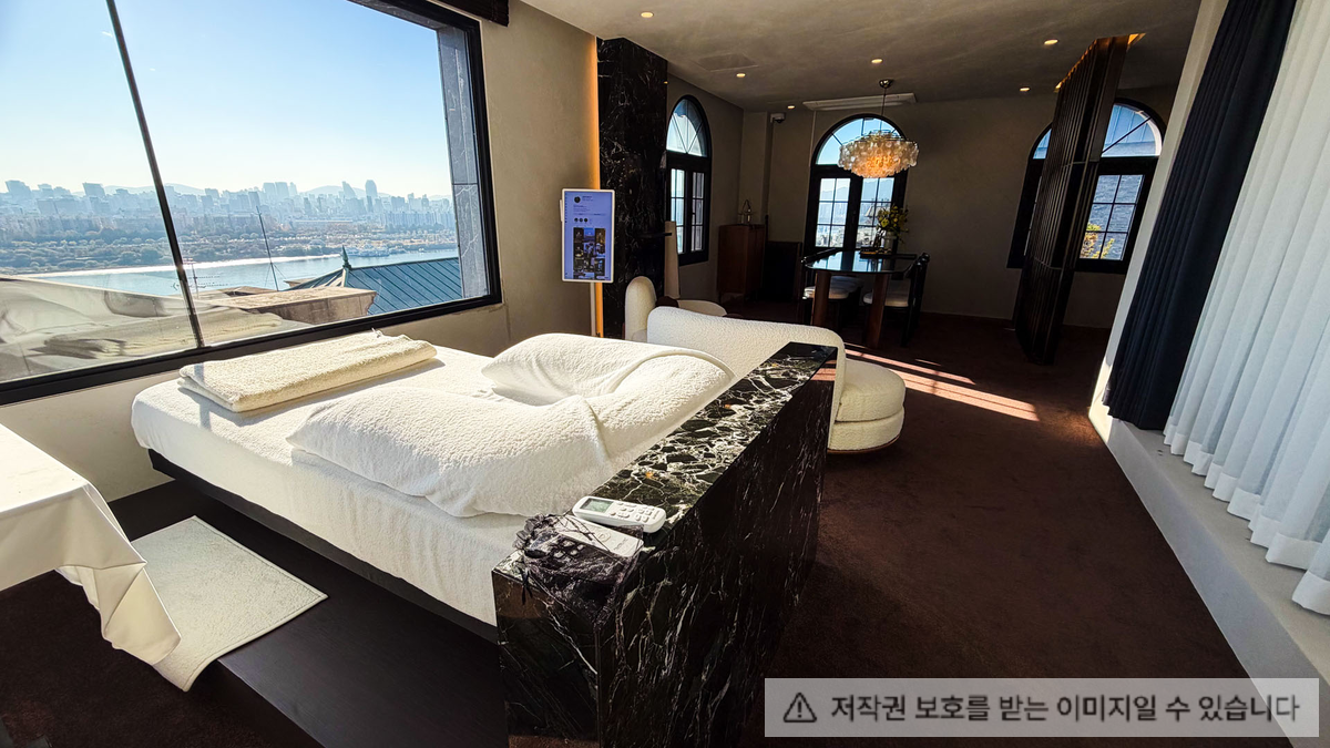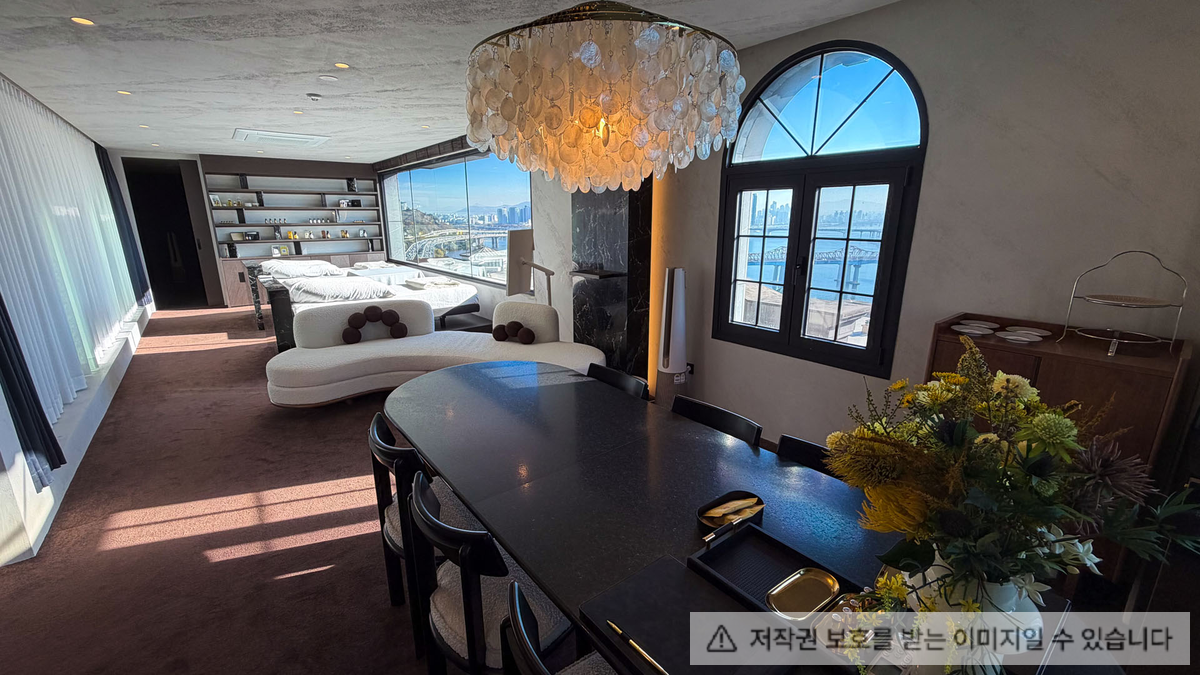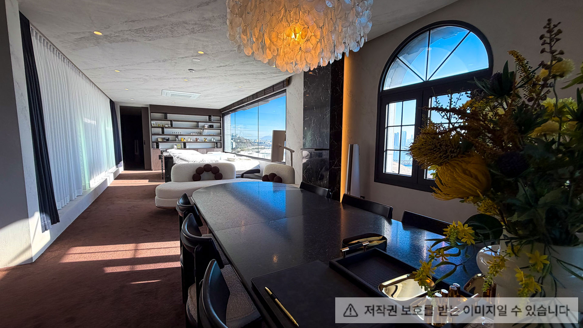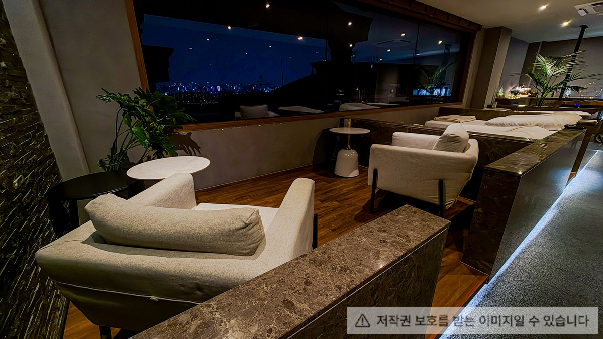 넓은 통창으로 비춰진 한강을 바라볼 수 있으며 호텔 라운지와 같은 분위기를 연출했다.