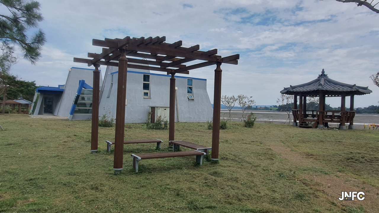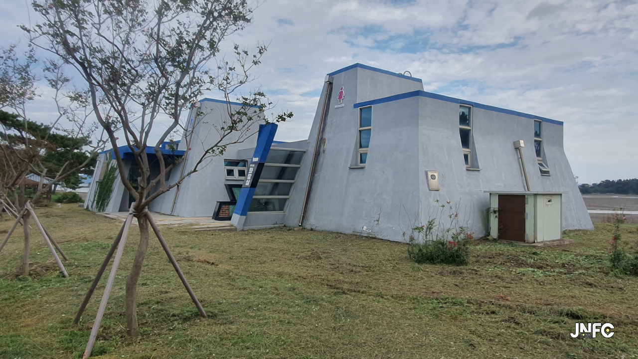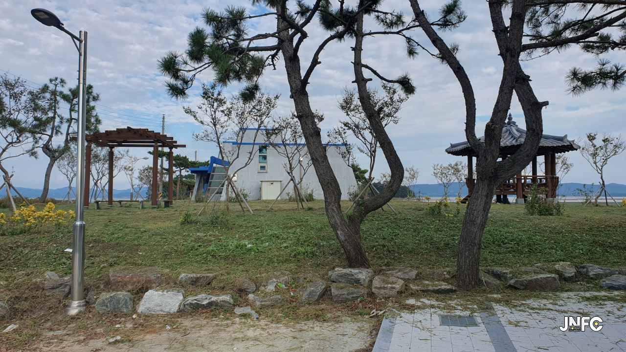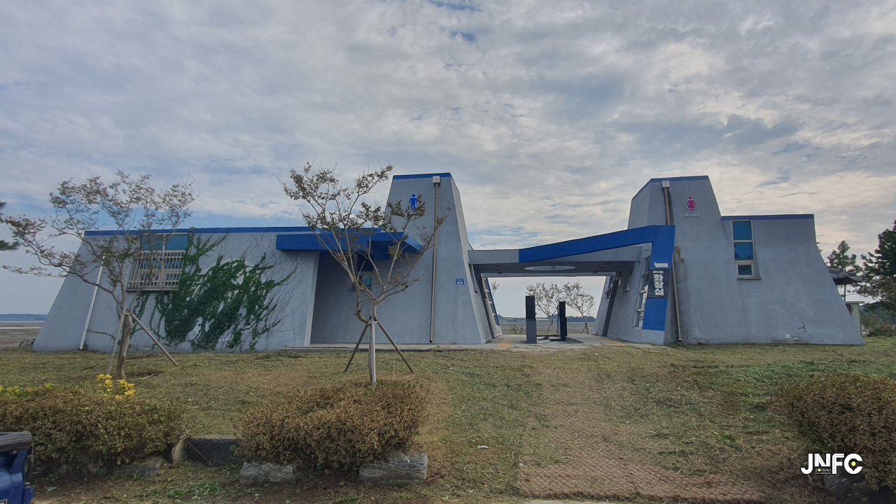 월두공원은 삼면이 바다로 둘러싸인 긴 섬 형태를 띠며, 특색 있는 화장실이 있다.