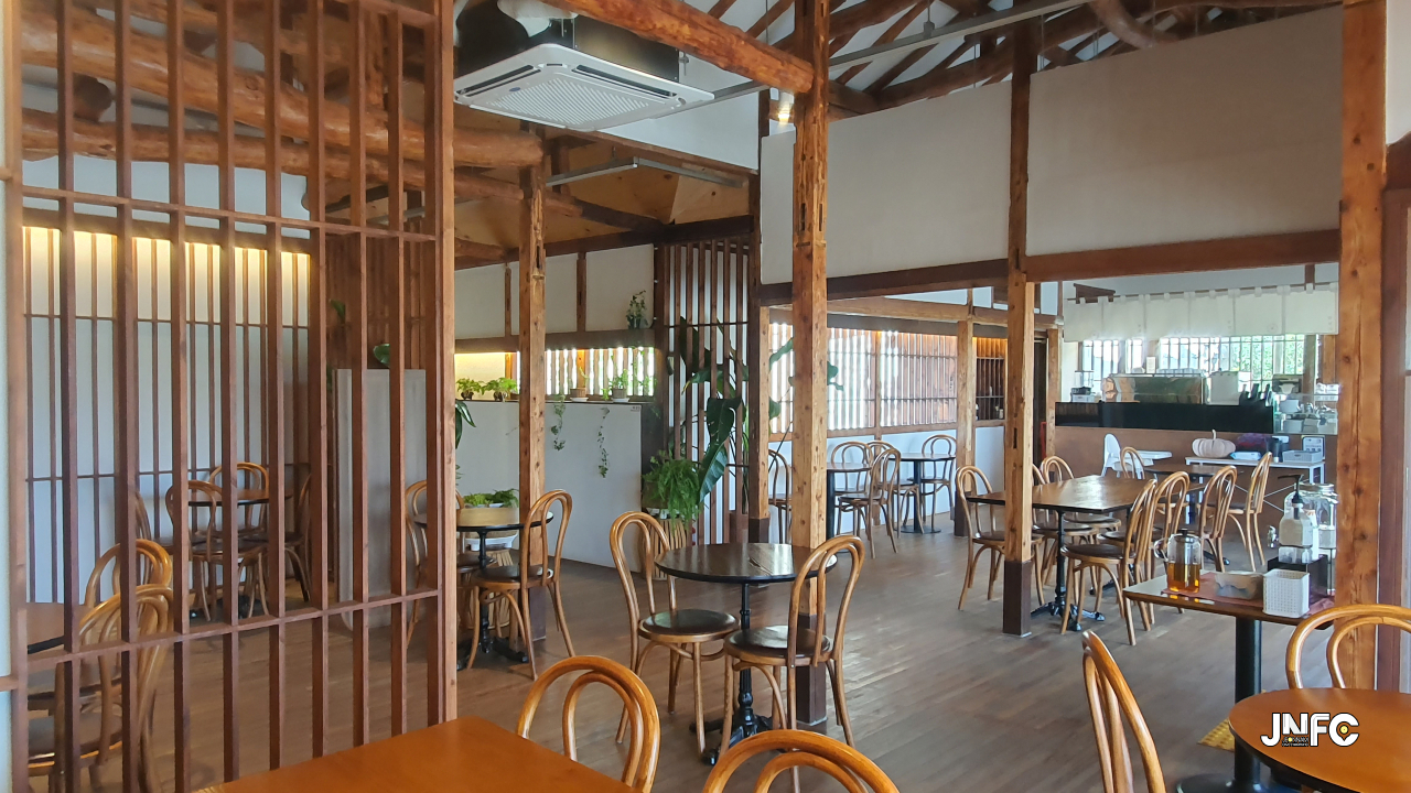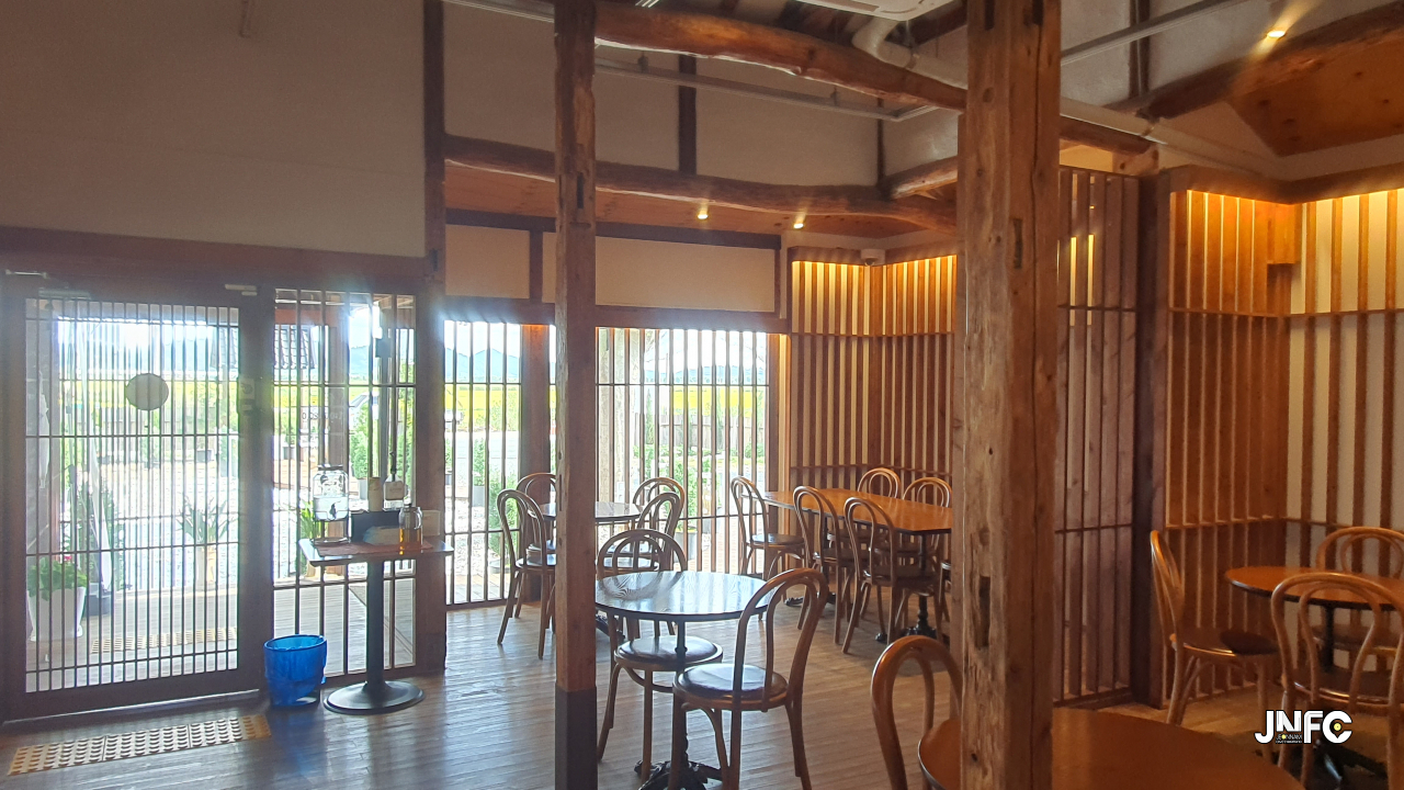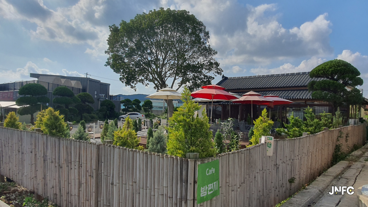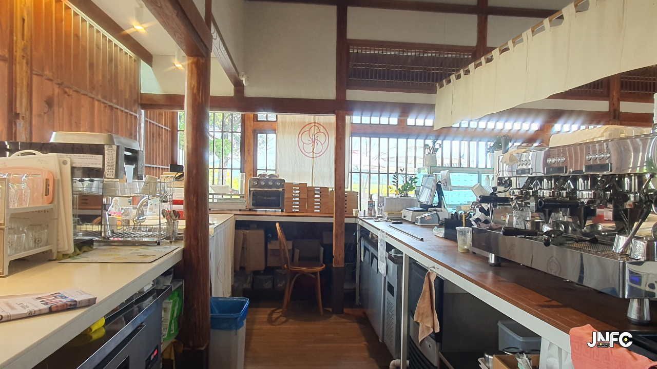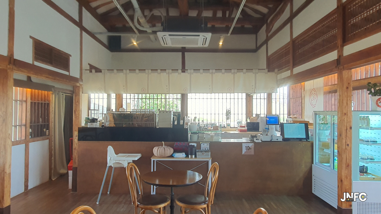 적산가옥을 개조한 카페이다. 자갈이 깔린 넒은 주차장과 가게 뒤로 텃밭이 있다.