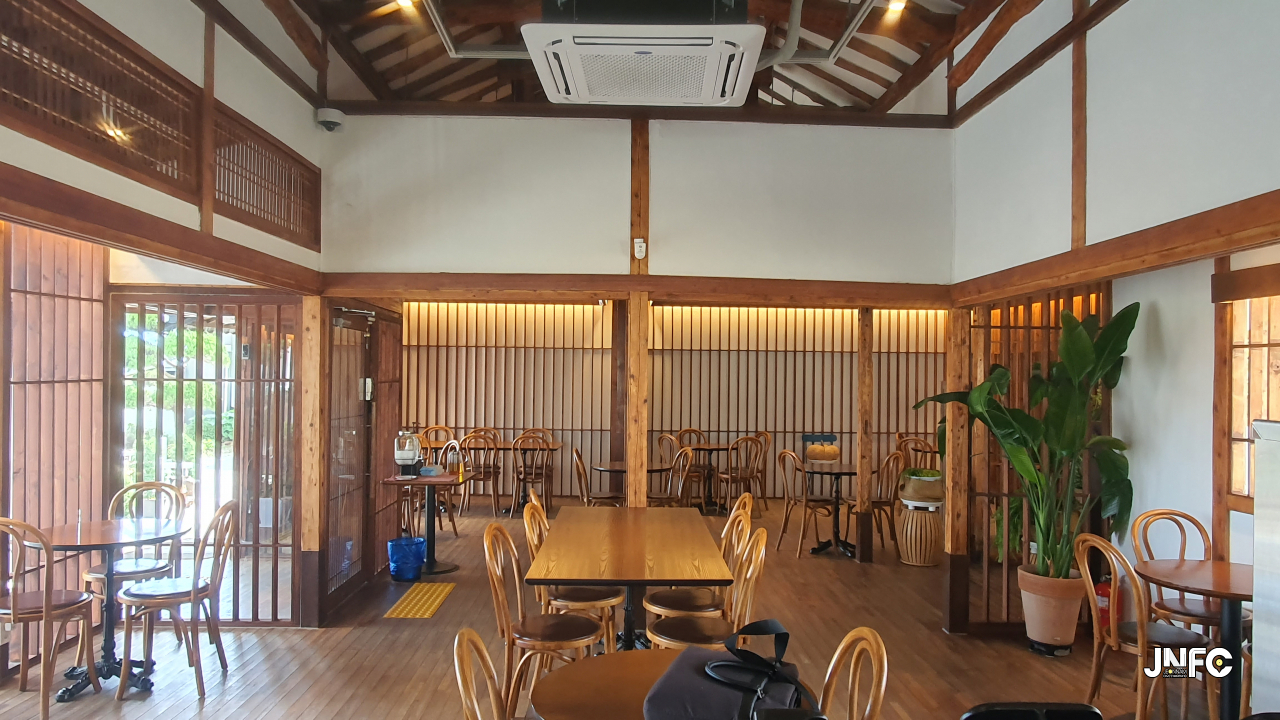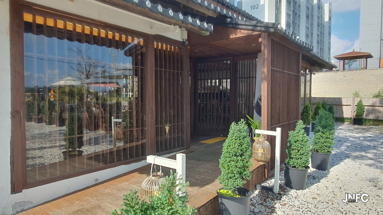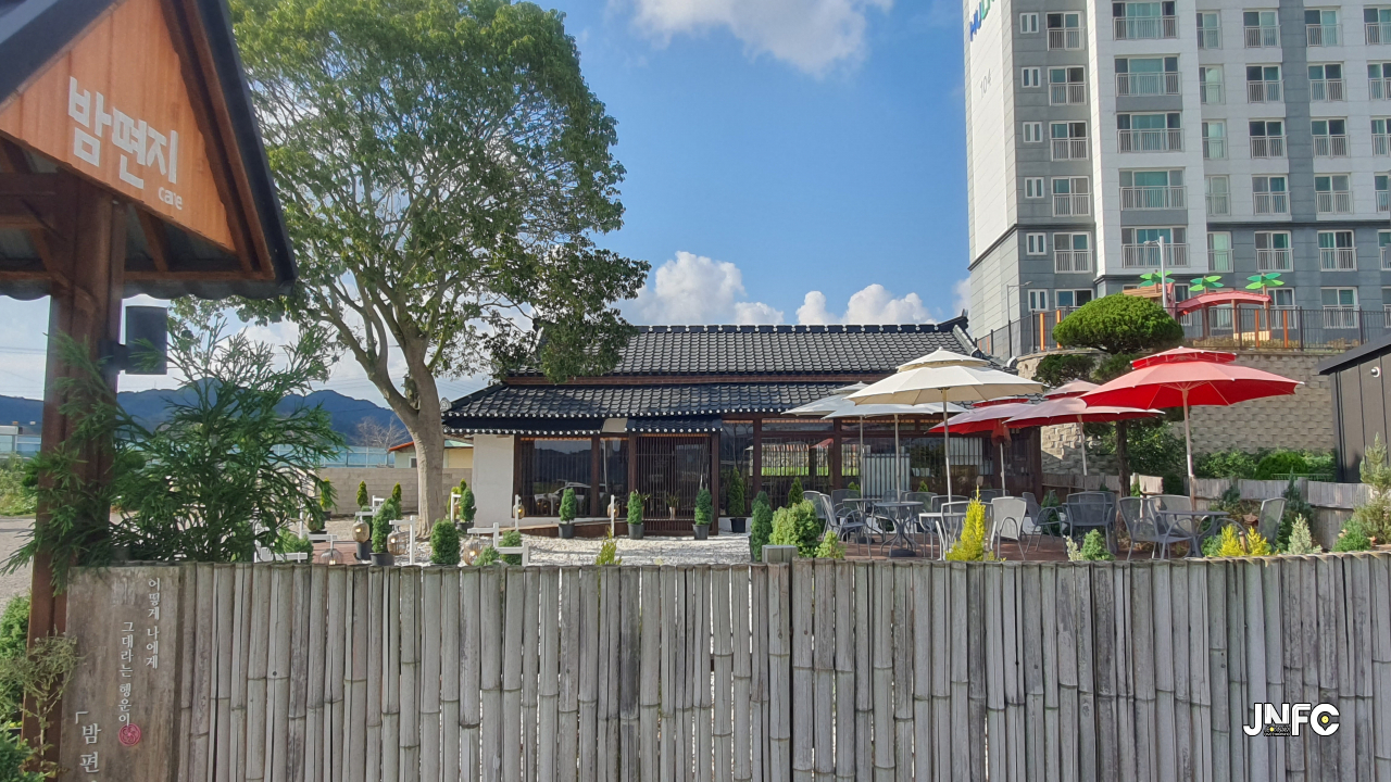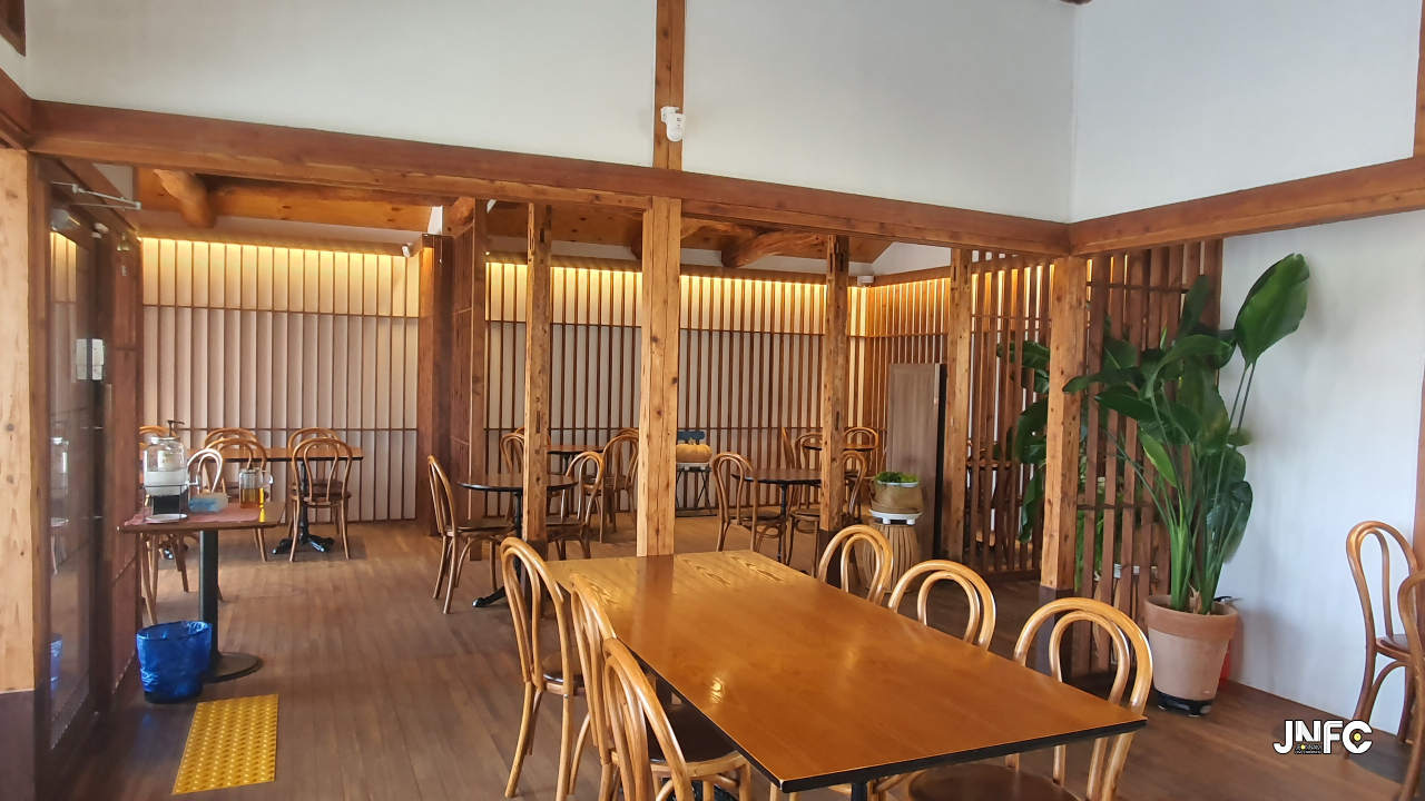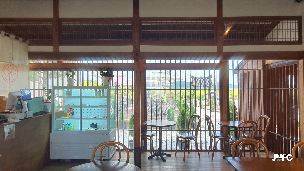 적산가옥을 개조한 카페이다. 자갈이 깔린 넒은 주차장과 가게 뒤로 텃밭이 있다.