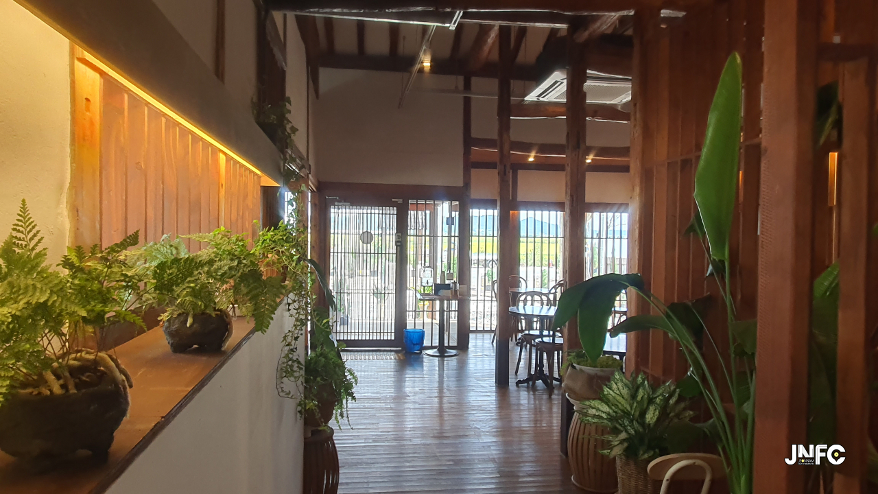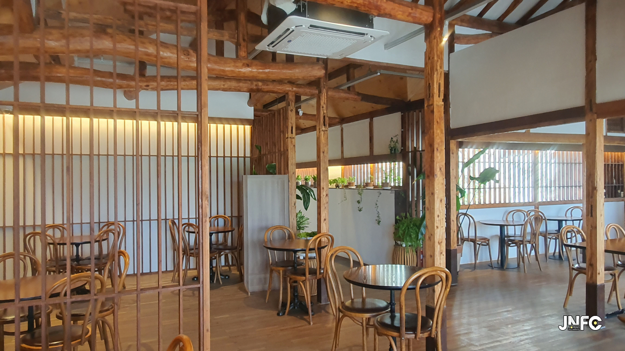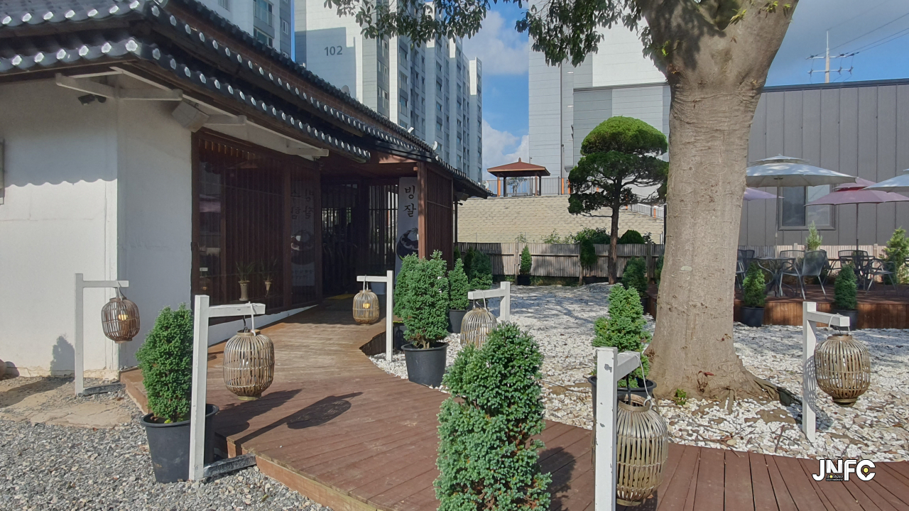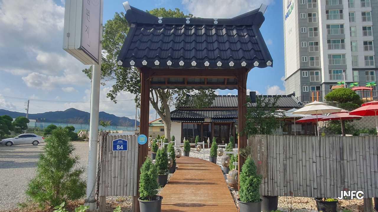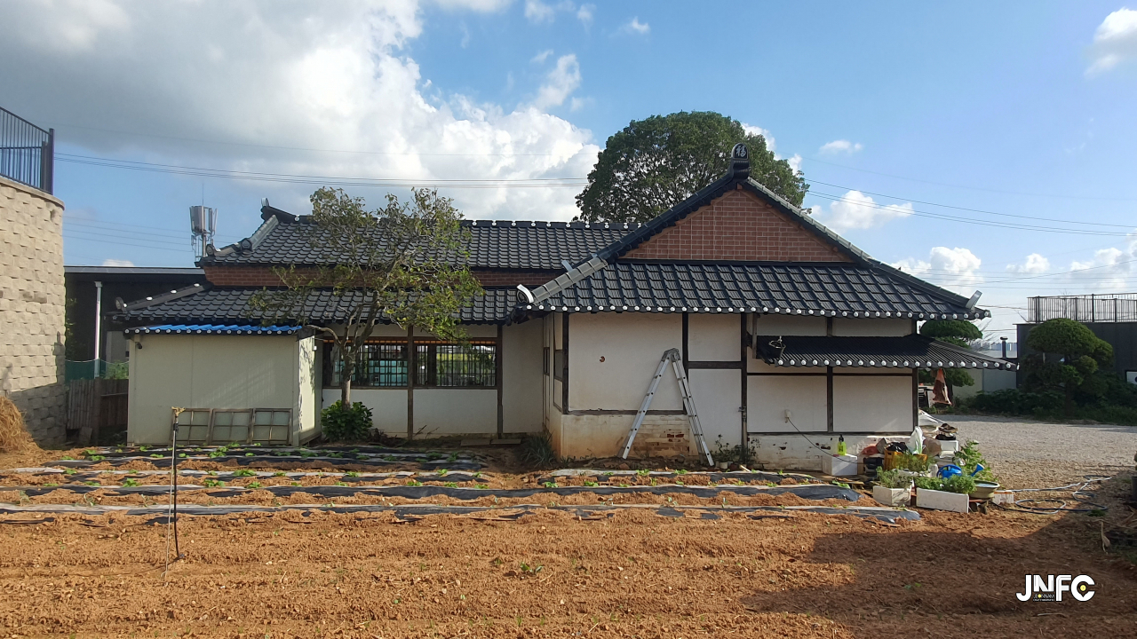 적산가옥을 개조한 카페이다. 자갈이 깔린 넒은 주차장과 가게 뒤로 텃밭이 있다.